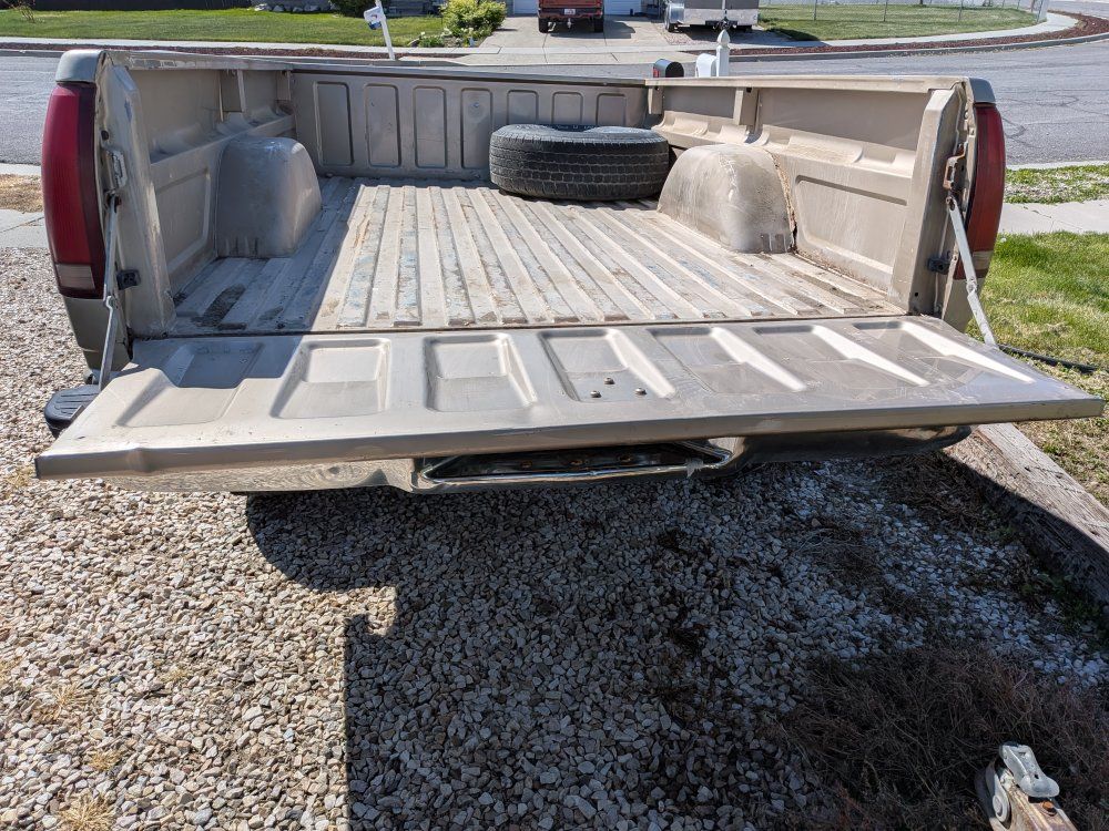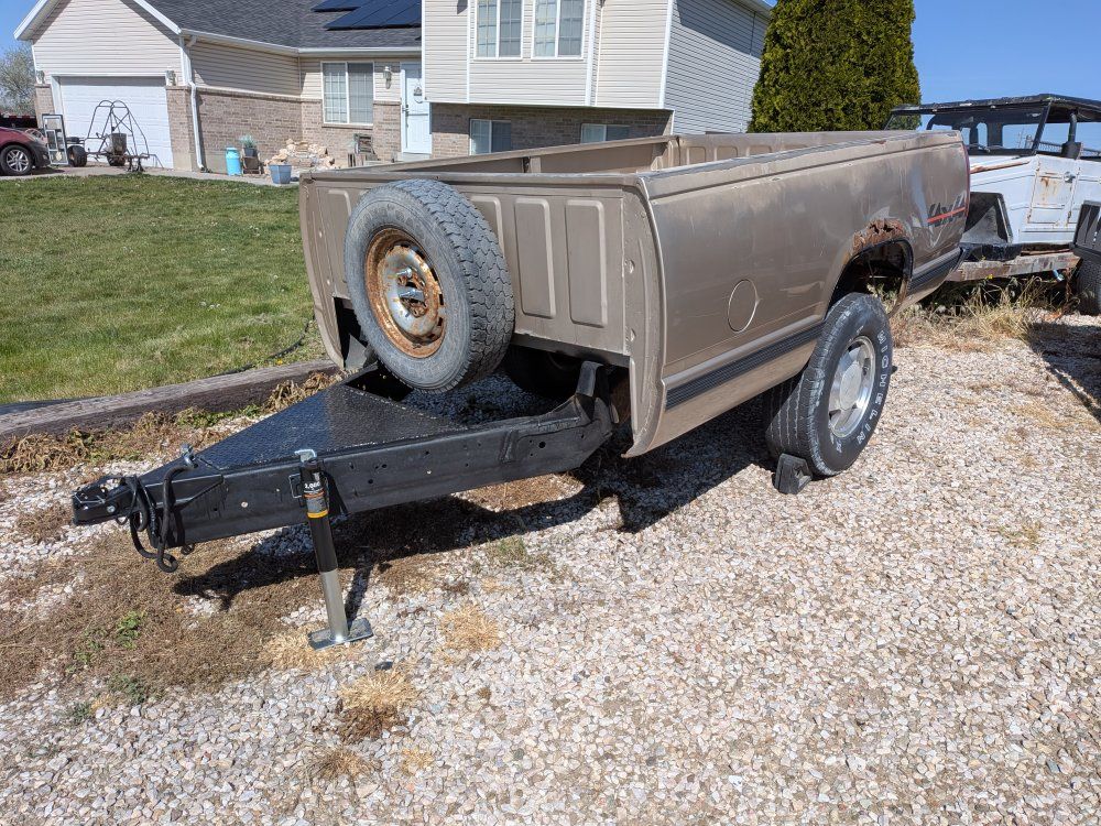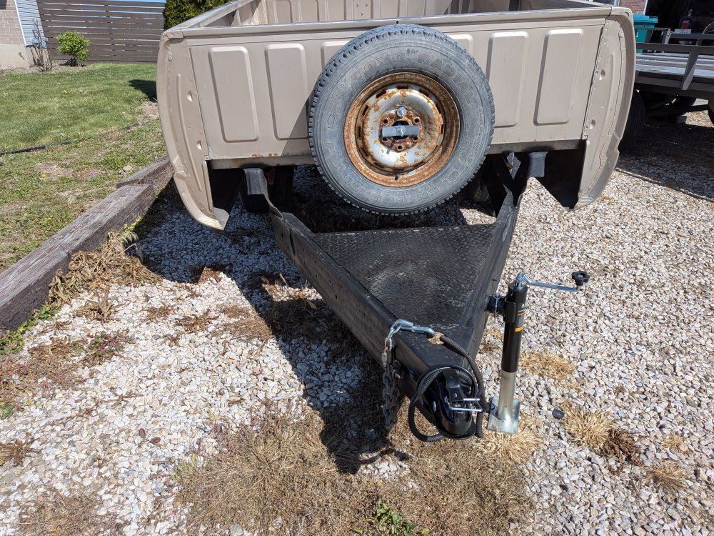 Venmo8' truck bed trailer, comes with 2 spares, flat 4 wiring and swing back jack.