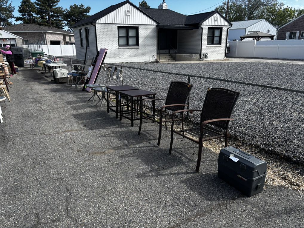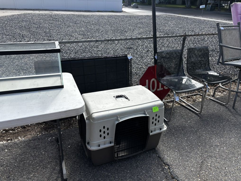 Small yard sale. Mix of yard and house stuff. Queen sized bedframe and headboard, pet stuff.