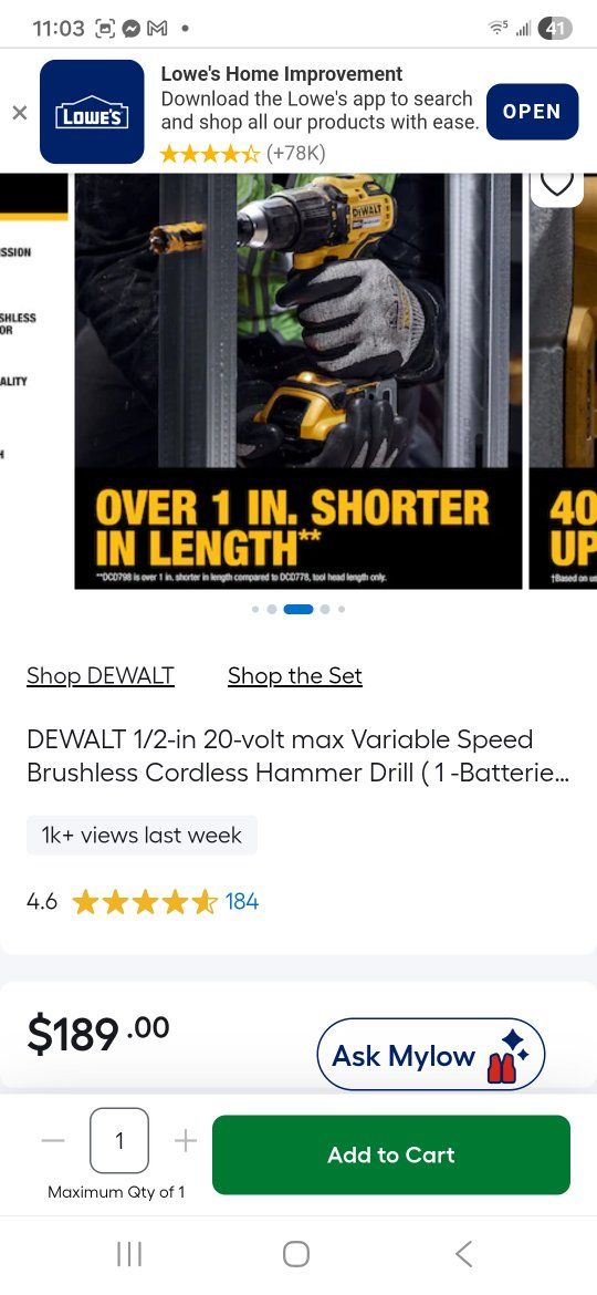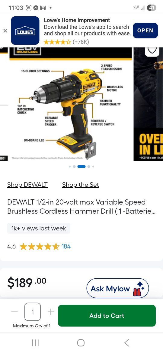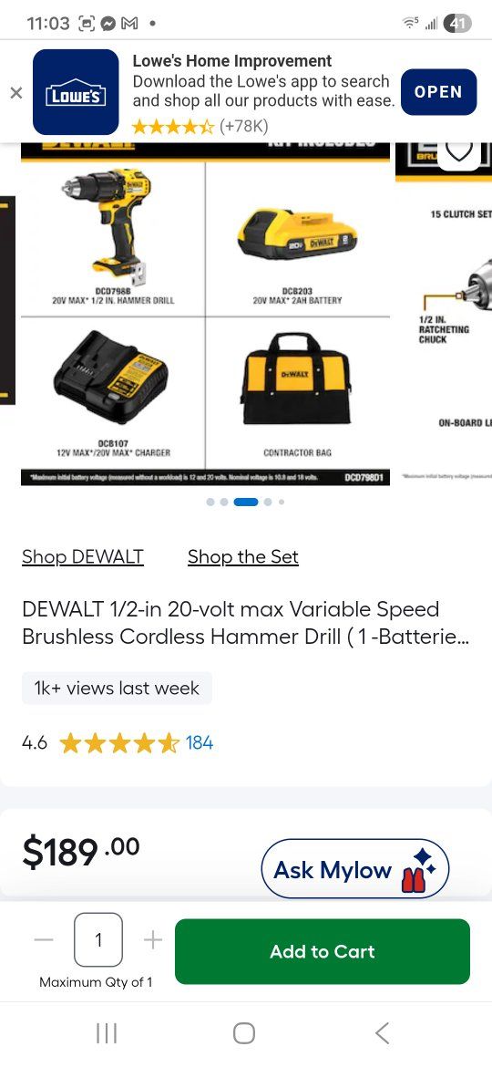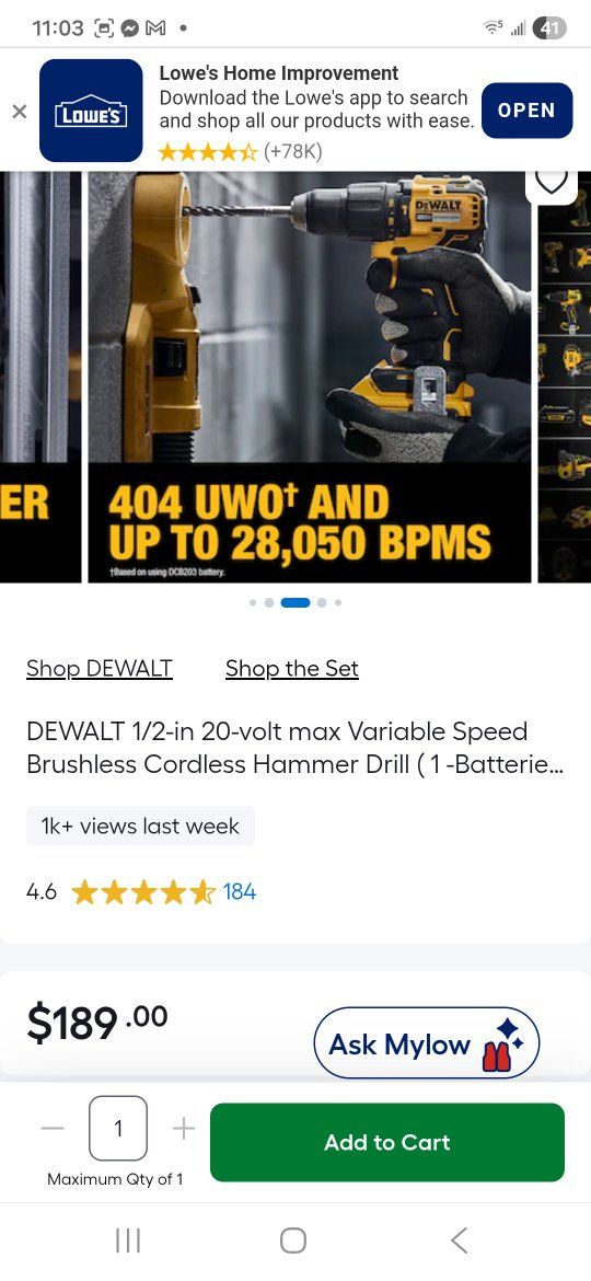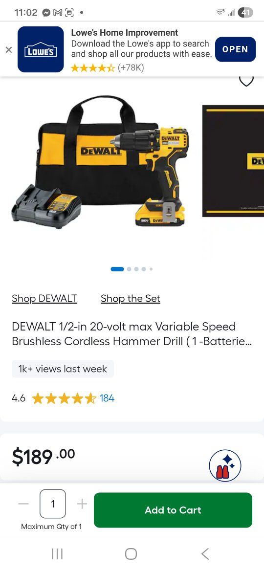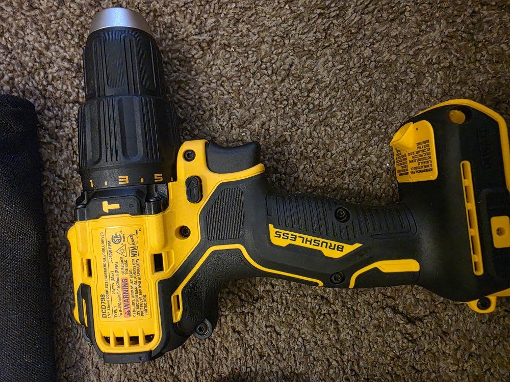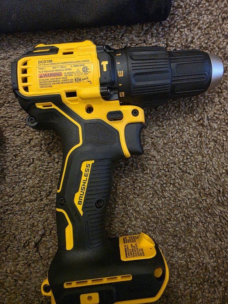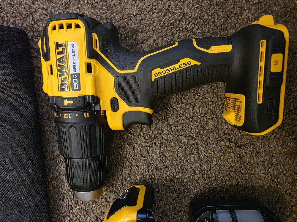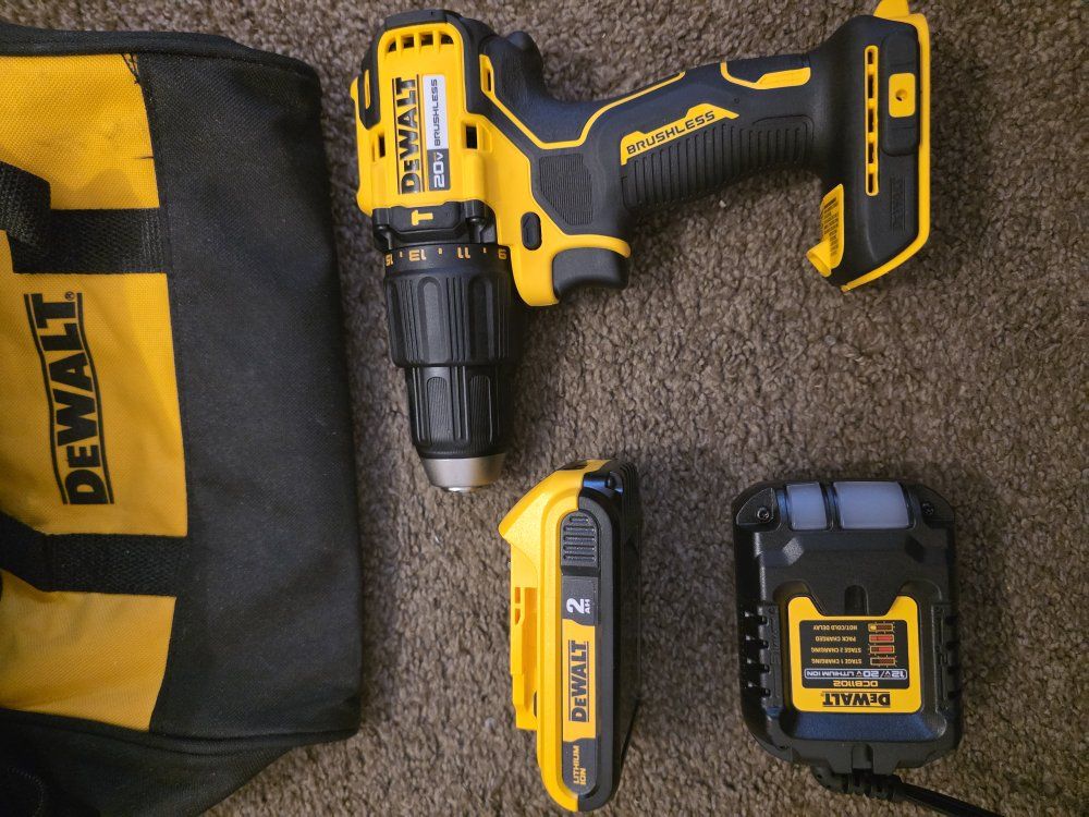 ZelleNew Dewalt 20V MAX Cordless Brushless 1/2in. Variable Speed Hammer drill Kit. Comes with one 2AH battery, charger, and bag. Lowes sells this kit for $189 plus tax, I am asking $100.