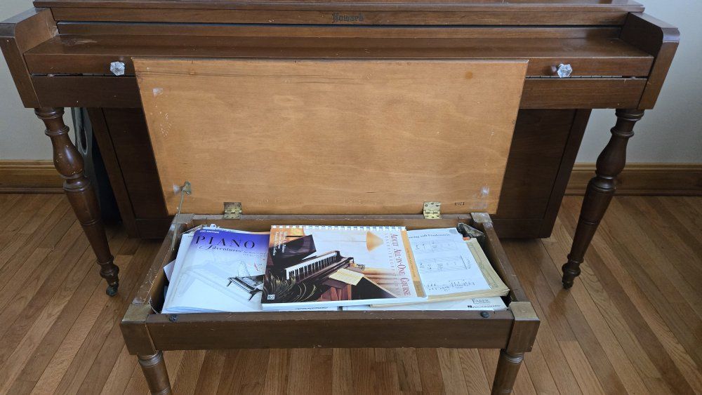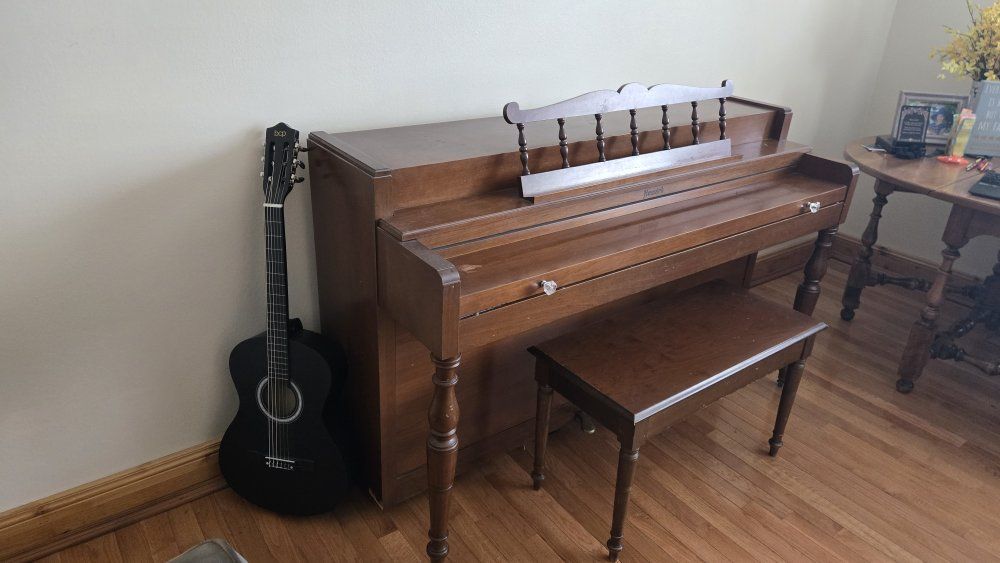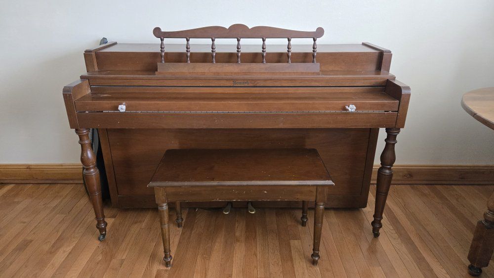 Beautiful Howard Piano. Measurements are 57" W x 23" D. Still works great and comes with tons of sheet music and lesson books inside the bench. Has been great for piano lessons with our kiddos but they have moved on.