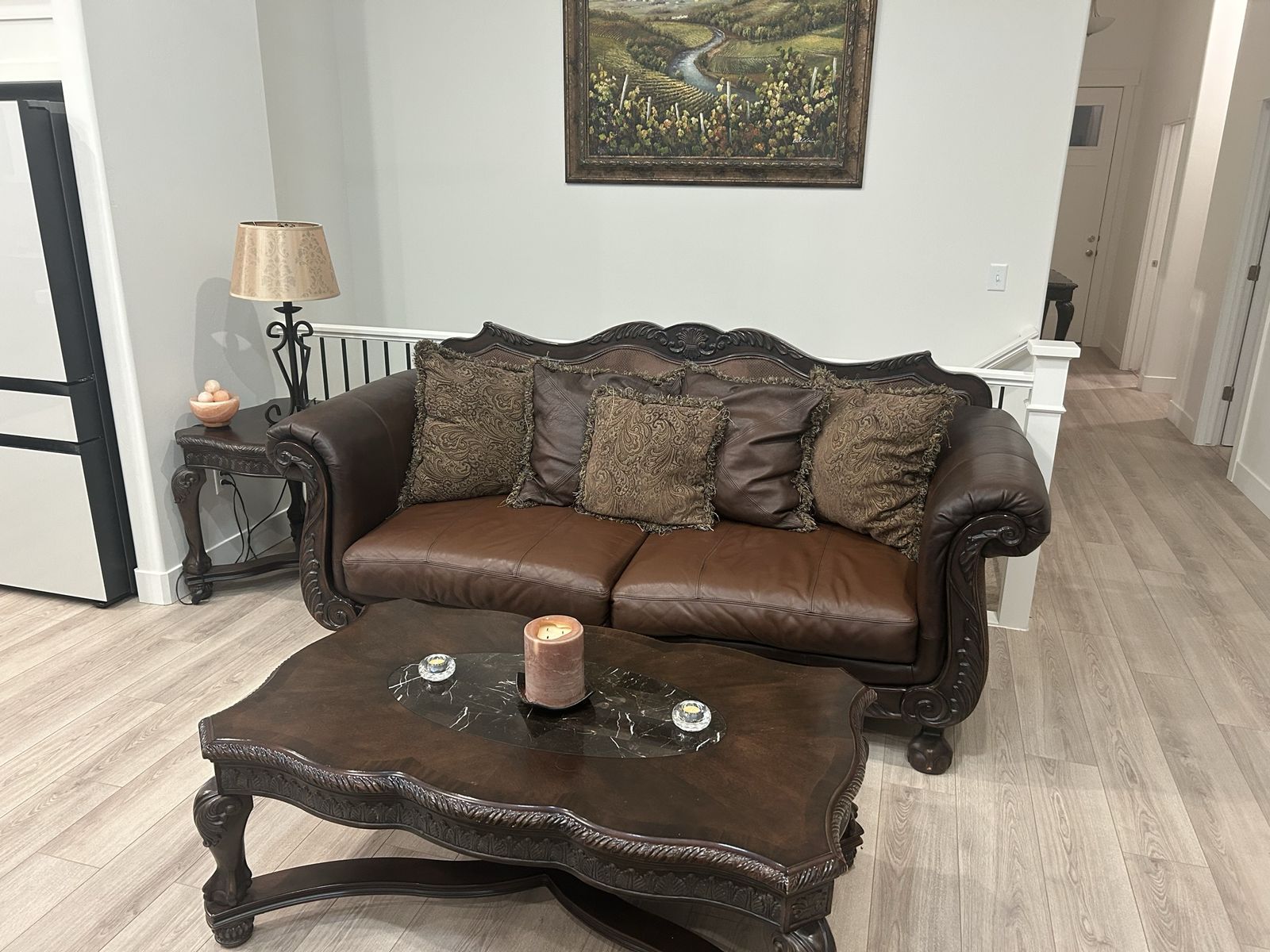 PayPal3 leather couch set with matching tables. 2 end tables 1 coffee table 1 couch back table.