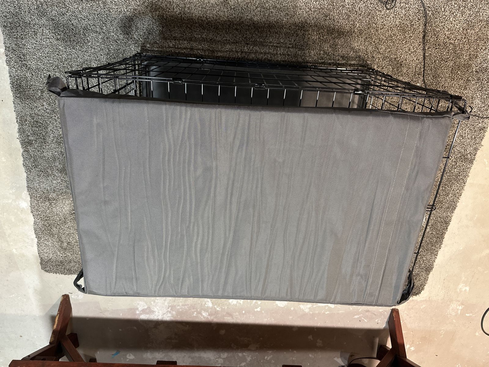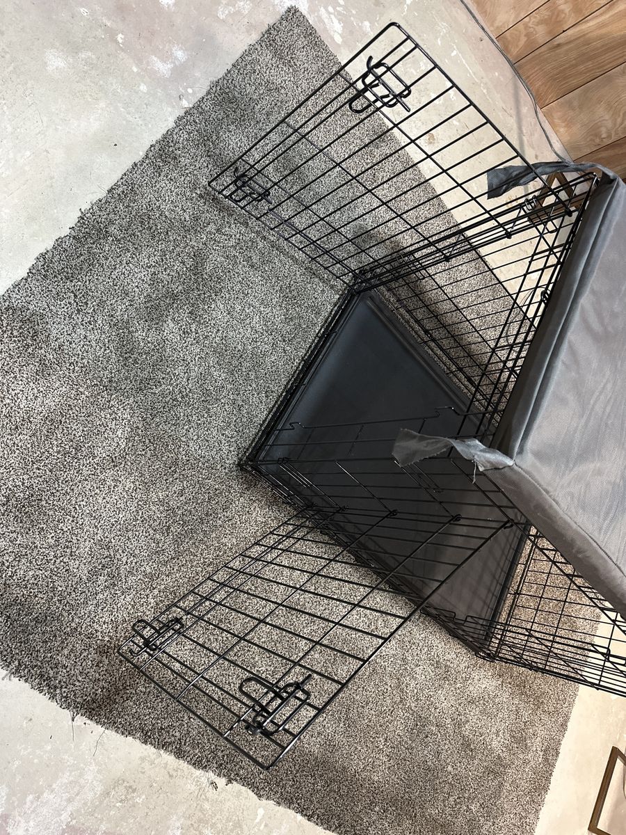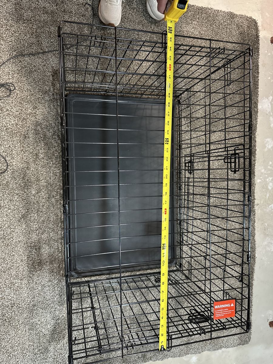 Folding Dog Create 36” long x 22” wide x 24” high. Has the two steel doors with secure locks. Comes with the plastic tray and “bully bed” tough pad. Used but Clean and as new condition.