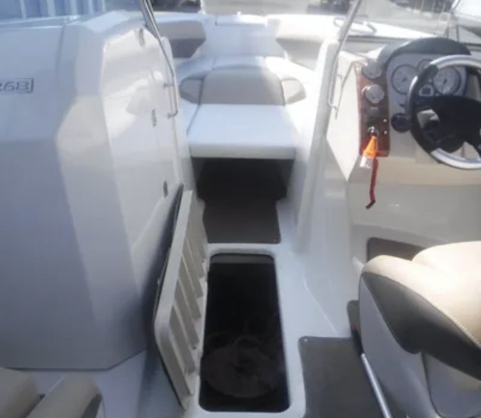 Fishing pole holders Cockpit sink, cutting board, faucet, recessed trash receptacle, cooler cubby