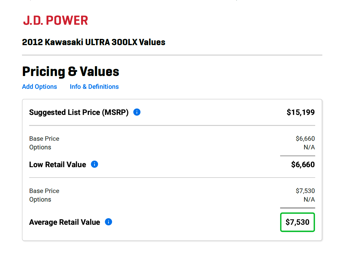 From Google: The 2012 Kawasaki Ultra 300LX is a high-performance, three-seater luxury personal watercraft (PWC) featuring a 300-horsepower, 1,498cc supercharged four-stroke engine. Known for its stable, deep-V hull, it is designed for offshore riding, long-distance touring, and reaching speeds of roughly 67-70mph. Key features include a specialized comfortable touring "LXury" seat, electronic trim, massive storage and electronic cruise control.