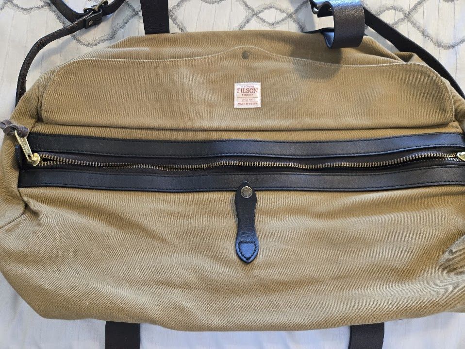 VenmoIn excellent condition. 43 liter capacity, dimensions are 20"x12"x13". Made in the USA. Bridle leather straps, brass zippers.