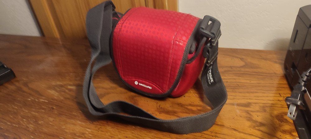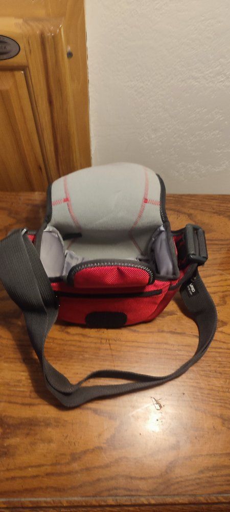 VenmoFor sale is this Camera carrying case in almost new condition, ideal for Canon cameras in bright red coloring with adjustable strap and internal adjustable soft divider.
