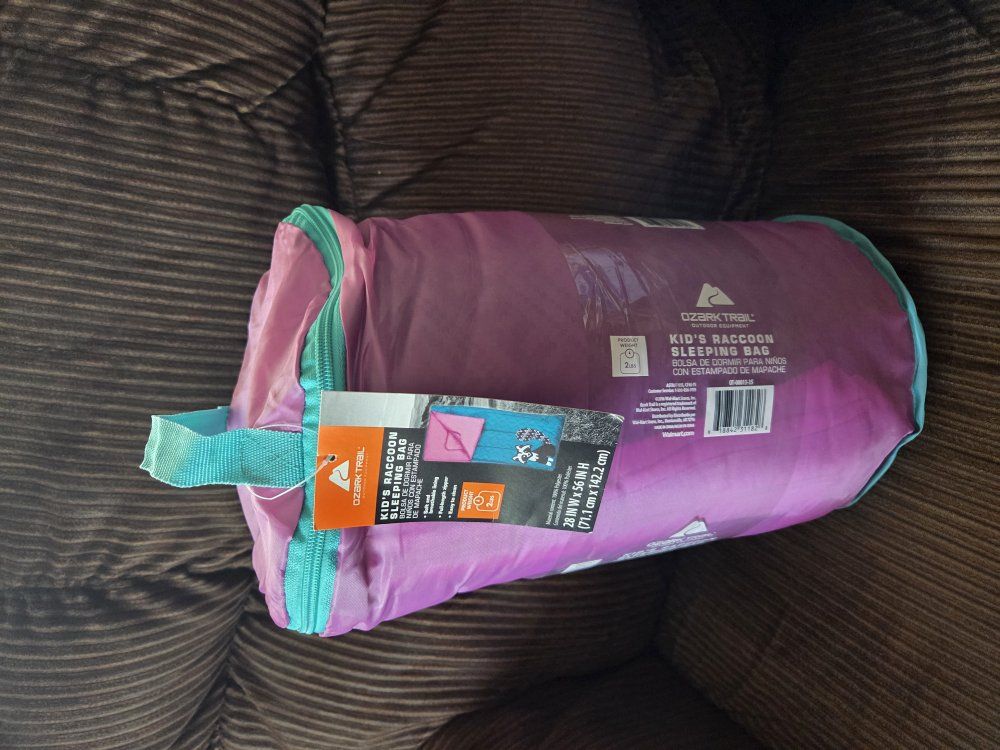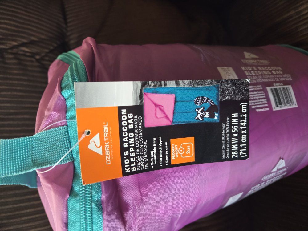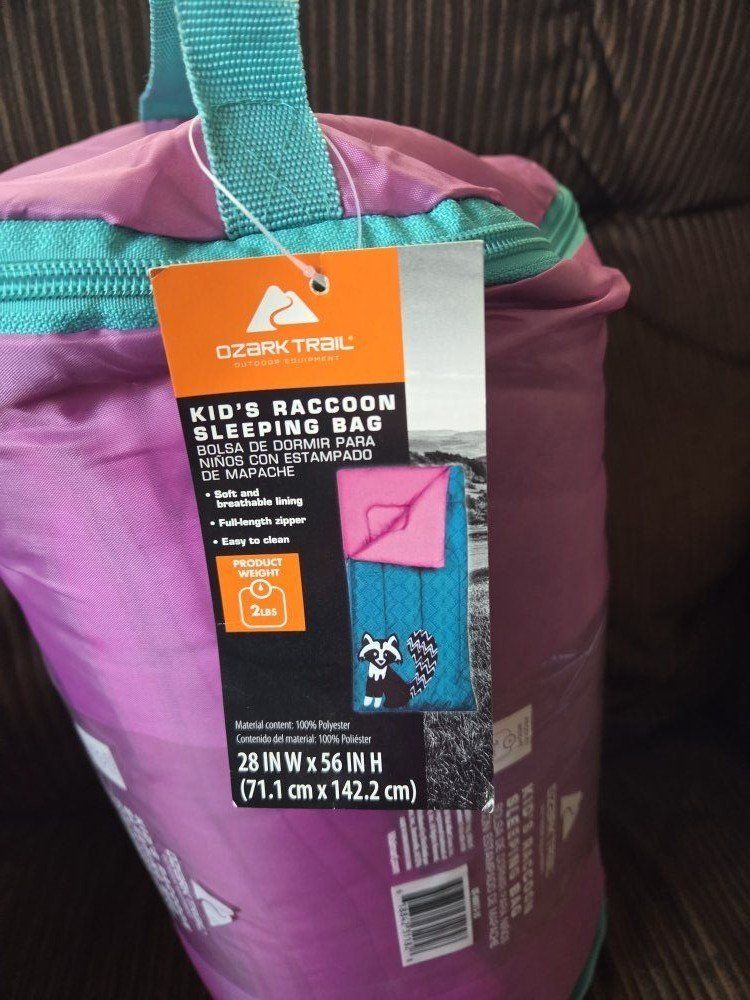 Brand new Ozark Trail kids sleeping bag. Brand new never been used. Still had tags. Girls blue and pink with racoon. This item comes from a smoke free home. Please contact me by text.