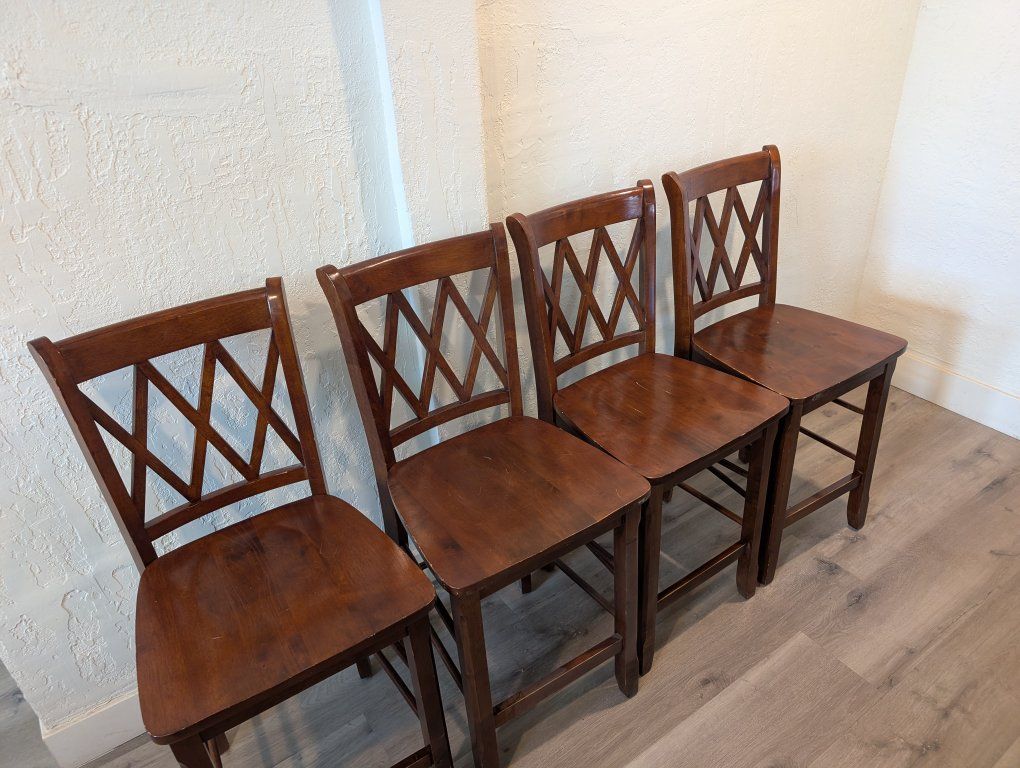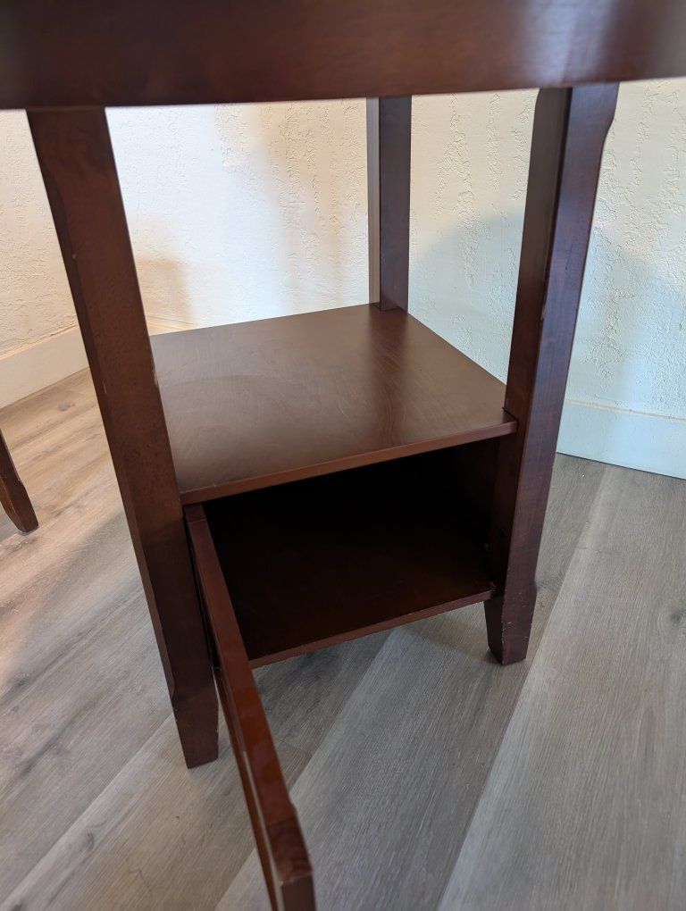 Tall, round dining table with chairs. 4' wide and 3' tall. Has a small cubby underneath