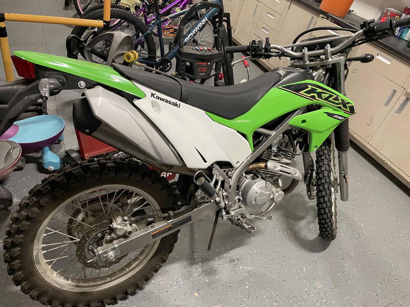 VenmoThis is a 2021 KLX 230 with only 224 miles total! The plastics are in great shape, and it starts easily with the touch of a button. I have the mirrors new in a bag that have never been installed if you want it to be street legal and drive it on the road. It has always been stored inside. I checked pricing and condition and have priced it on the low end of what is listed currently. I am firm on the price. If you are in the market for a bike like this, you will like this one.