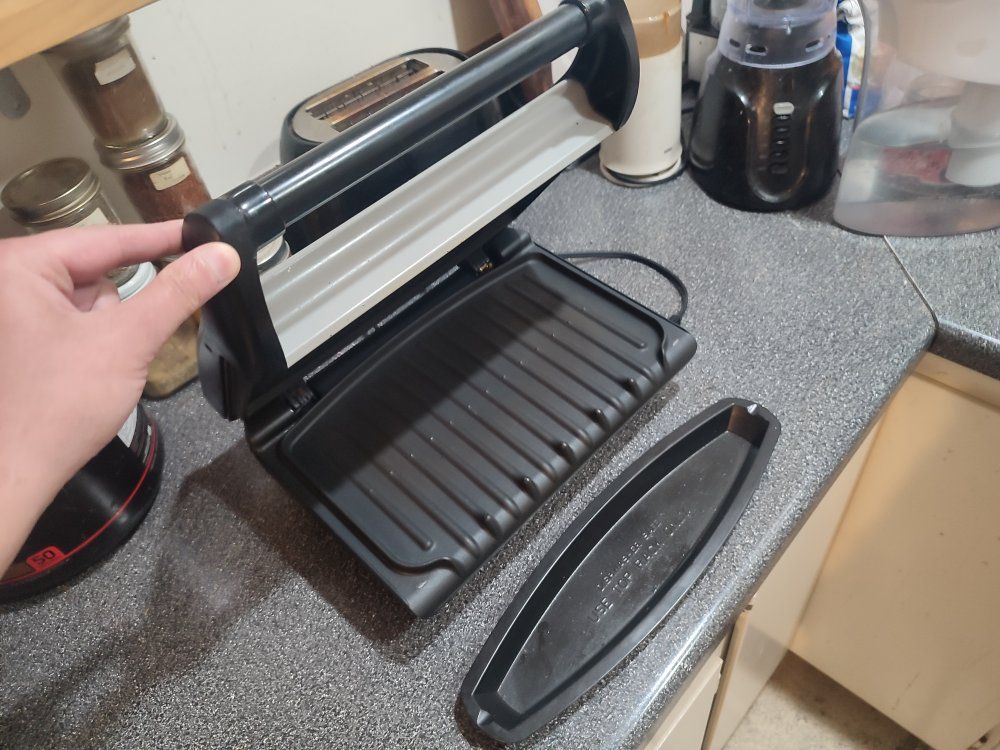VenmoGeorge Foreman Electric Grill XL size. This thing was a life saver for me when I was pressed for time and trying to eat healthy. just slap on some seasoned chicken breast and watch it work it's magic. works great, cleans easy.