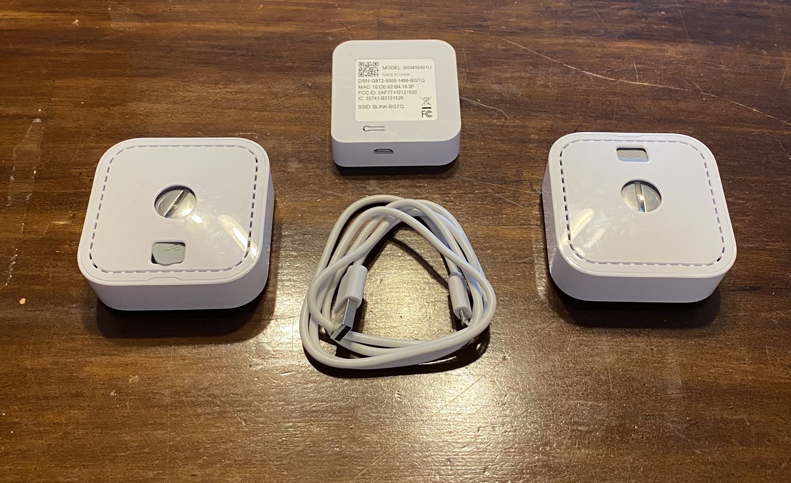 ApplePayBlink Indoor Camera Hub and 2 cameras with batteries and cable. Model BSM00401U. No wall adapter included in the purchase.