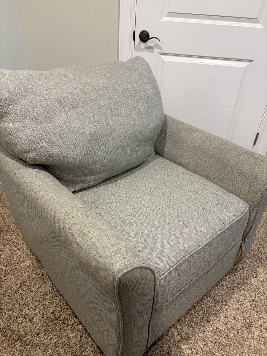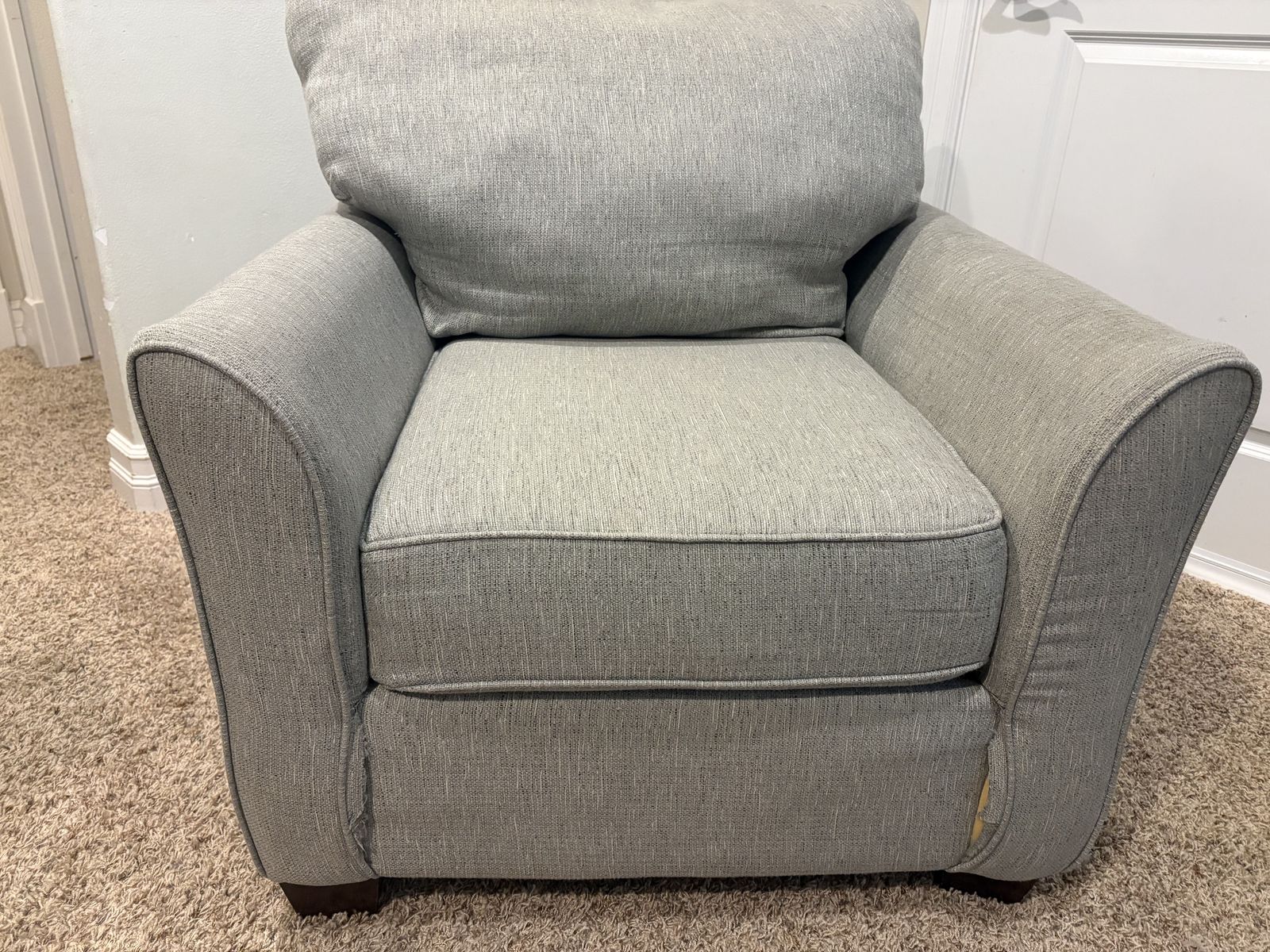 The right arm is dirty and could use cleaning, but this fabric has cleaned up easily in the past. Near the bottom front, some of the fabric has come untucked. Otherwise, it is a solid chair with normal wear and tear.