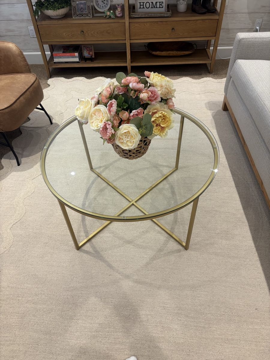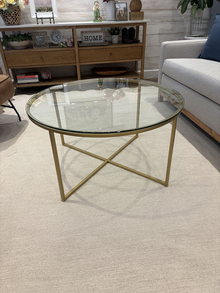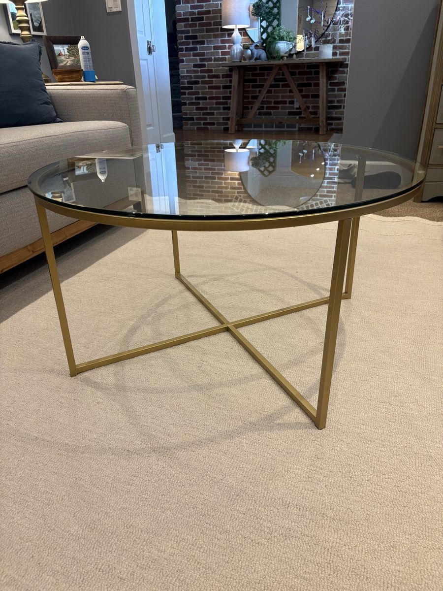 VenmoReally nice, brand new, bronze based, glass topped coffee table. Dimensions are 35 inches across and 18.5 inches tall.