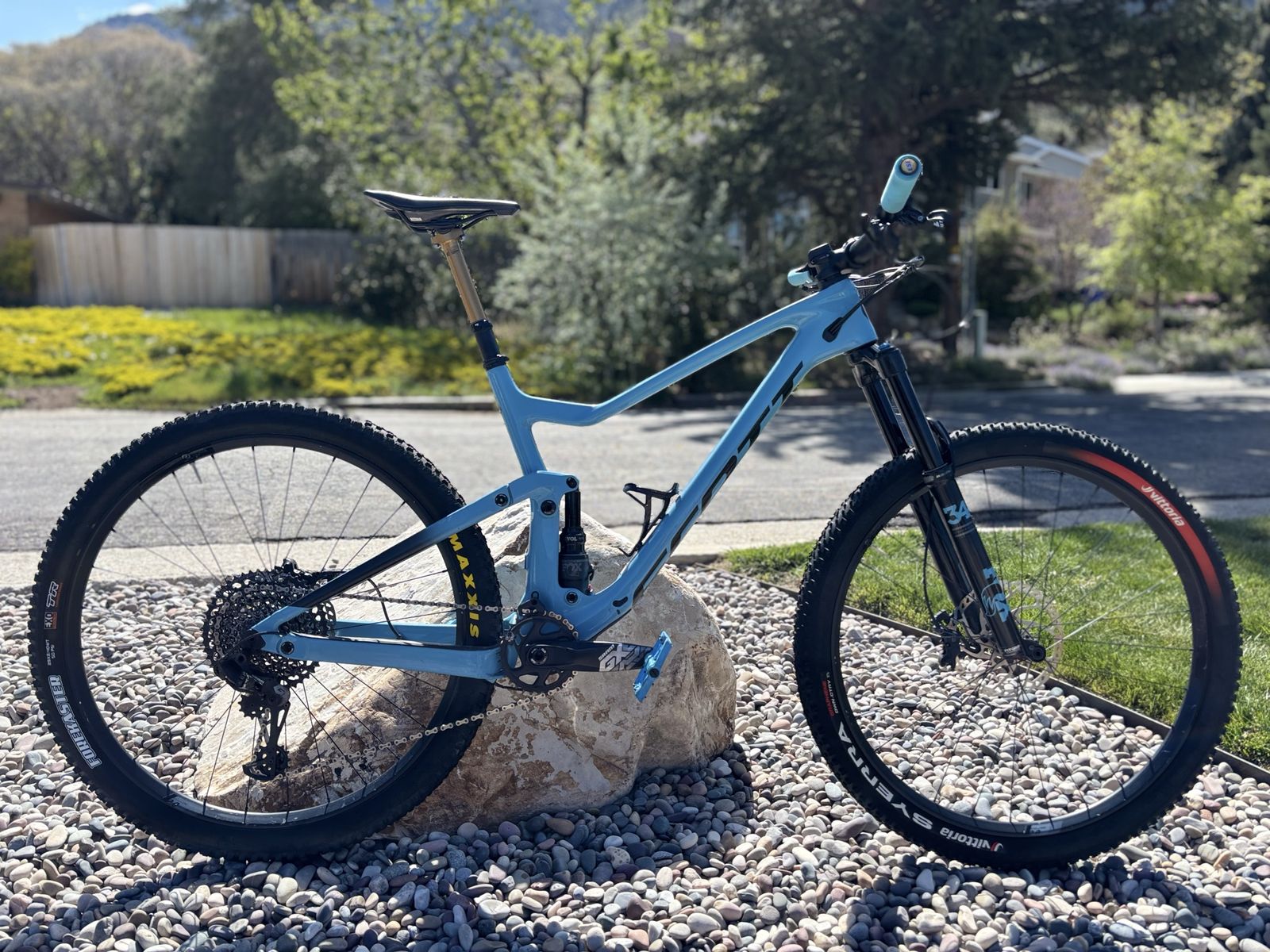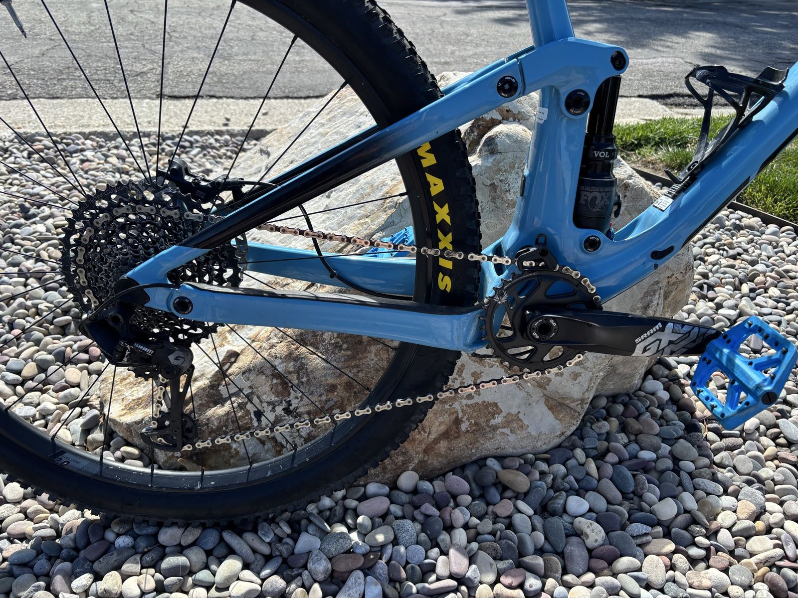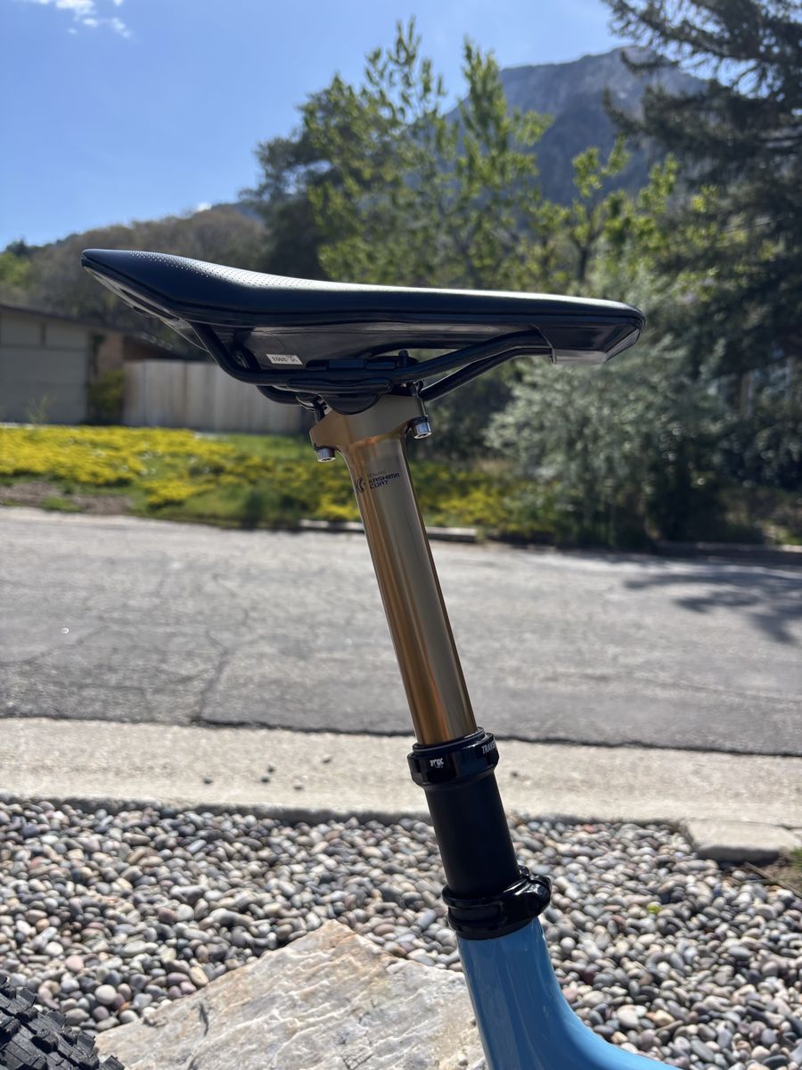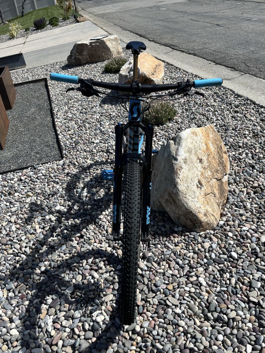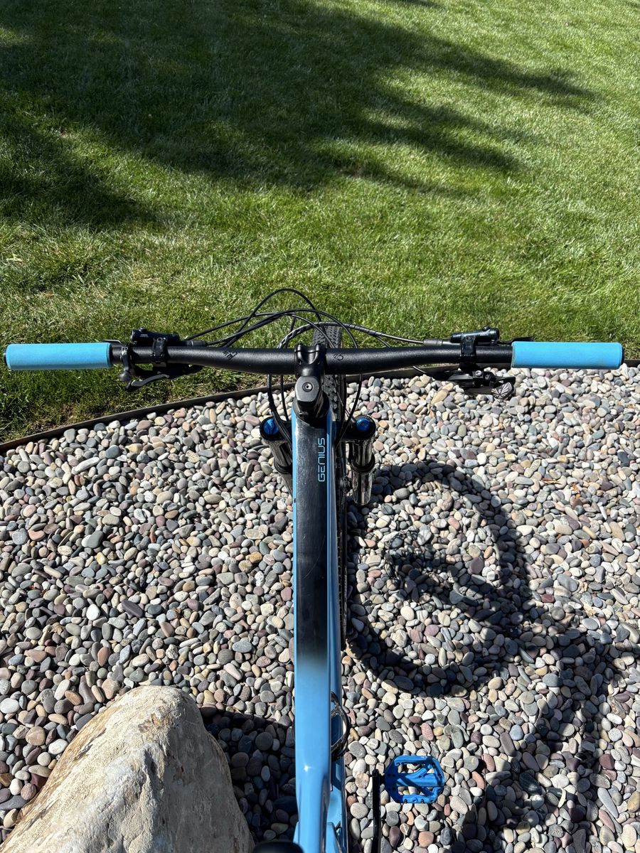 VenmoLarge frame carbon frame with aluminum triangle. Fox 34 suspension 140mm front and 120-130 mm rear. GX mechanical drive train and just got serviced so works like a charm. New chain and grips and just put in a fox transfer SL dropper post in. Everything works like butter and the brakes a in great condition. I have really loved this bike for gnarly trails and regular trail riding.