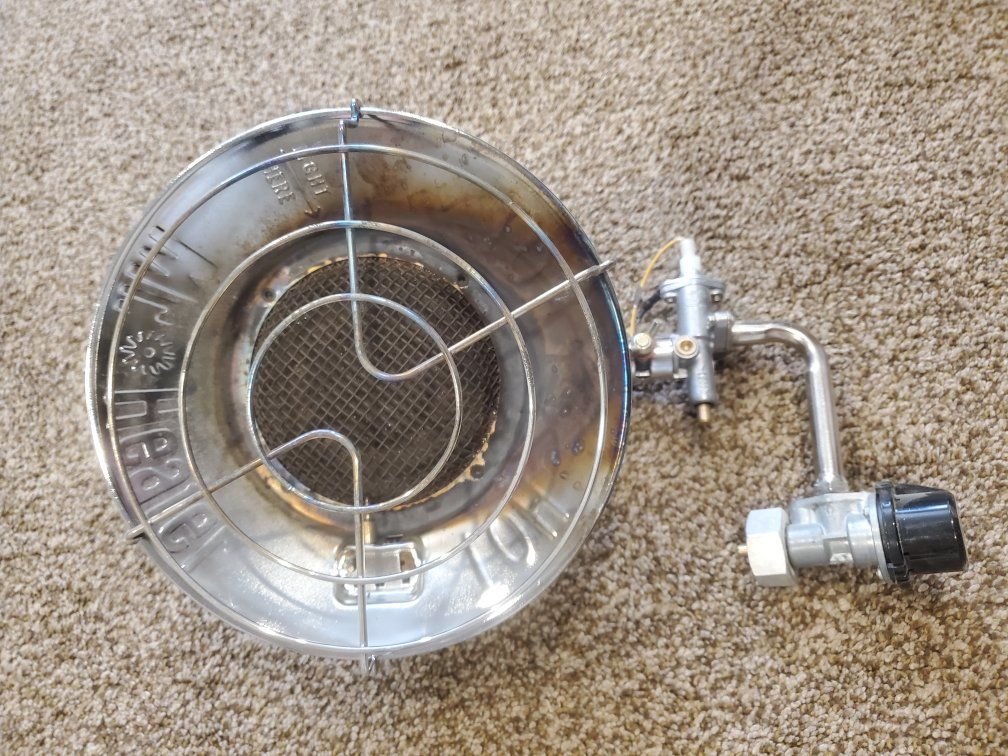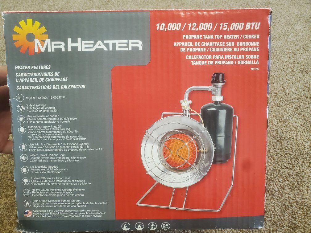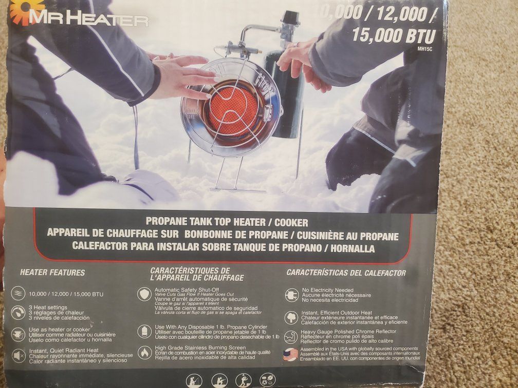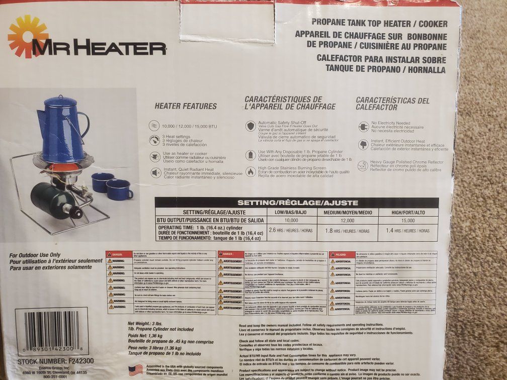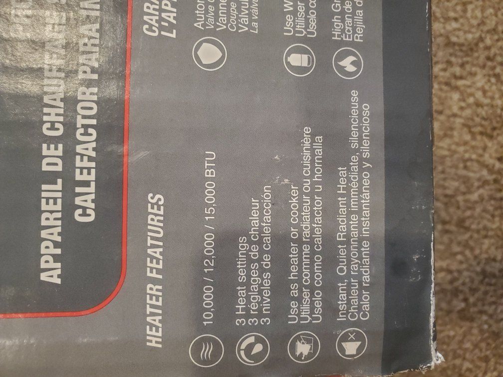 This propane heater and cooker takes the one pound propane bottles. There are 3 settings for low (10,000 BTU's), medium (12,000 BTU's), and high (15,000 BTU's). It has been used but works well without issues. Comes with the original box and instructions.