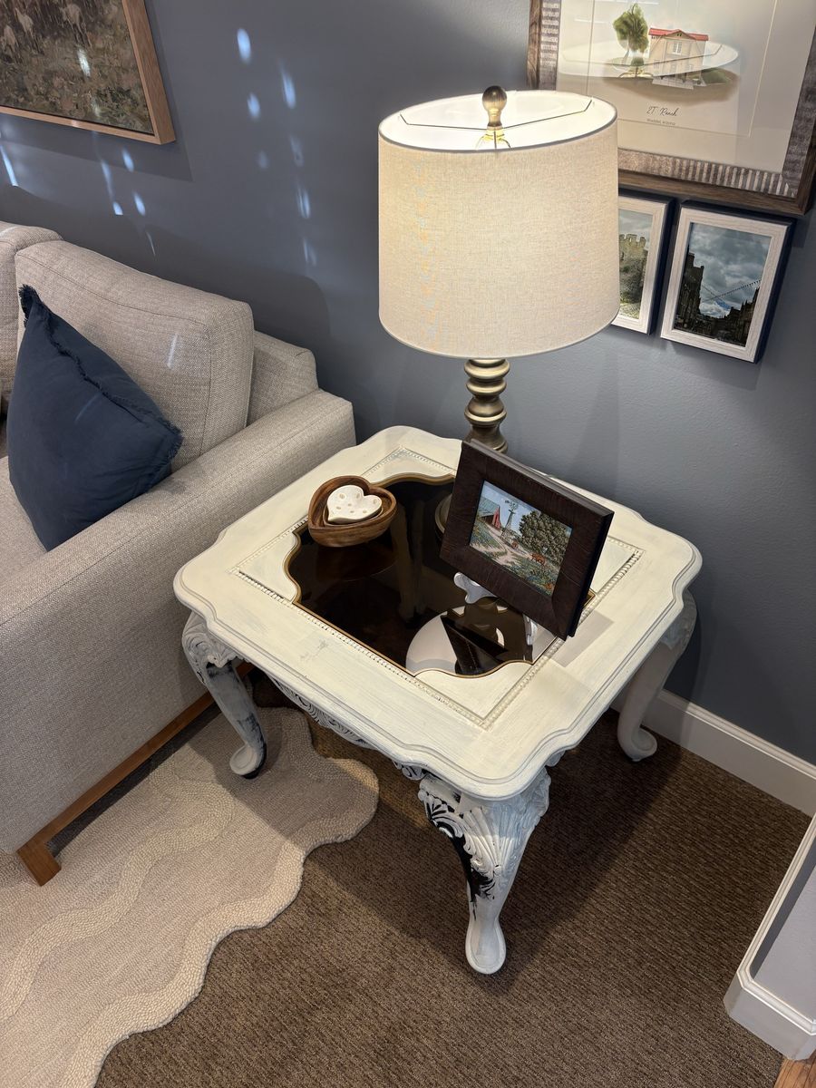 VenmoFrench style side table, squared custom glass fitting top, painted two tone white over black.