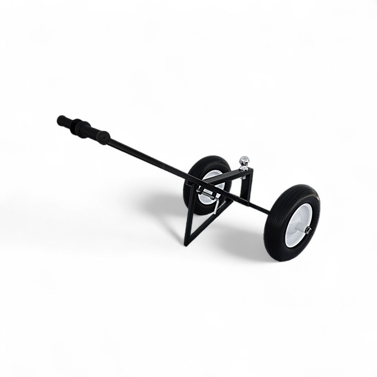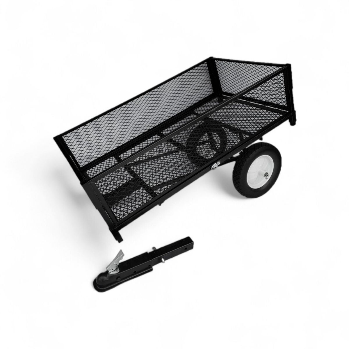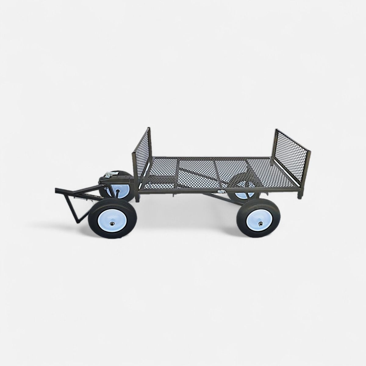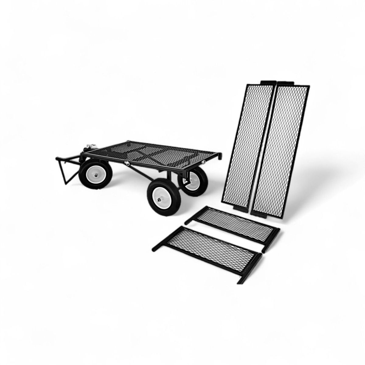 The Ultimate Cart and Dolly is made with 100% steel welded construction. The metal wheels with 15″ no flat tires, make it possible to move over 1200 lbs across rough terrain. The dolly has a standard 2″ ball and the cart has a standard 2″ hitch. The dimensions of the cart are 30″ x 52.5″ and 20″ high. This verison of our cart is made to be taken apart to have a thin profile. It folds up and comes in boxes. This version comes with 12″ side set. The coupler with the cart can be extended out to attach on a atv or quad. The reciever can take any 2″ coupler attachment.