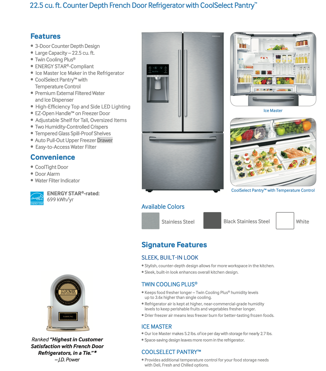 SAMSUNG 36 Inch French Door Refrigerator with Twin Cooling Plus™ System, CoolSelect Pantry™, EZ-Open™ Handle, Adjustable Three-Way Shelf, LED Lighting, Ice Maker, External Filtered Ice/Water Dispenser, 22.5 cu. ft. Capacity and ENERGY STAR® Rated: Stainless Steel