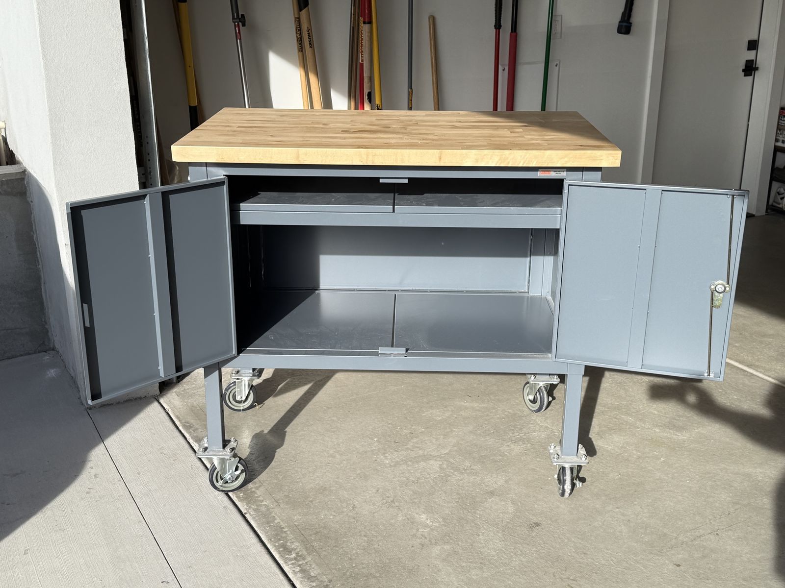 VenmoLike new. Uline sells for $920. Customizable shelving, mobile, maple top workbench with locking cabinet. Adjustable height in 2” increments. Large, 5”industrial duty caster wheels. 48” x 30”. Height: adjustable from 35”-45”. Weight capacity 1200 lbs., shelves capacity 250 lbs.