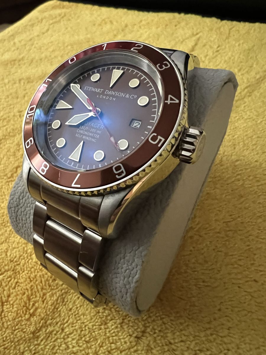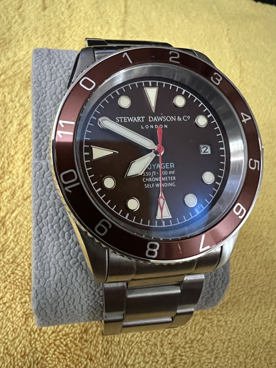 Elegant Stewart Dawson & Co. Voyager automatic watch has a striking burgundy dial and matching 12-hour rotating bezel. This timepiece features a stainless steel case and bracelet with a secure folding clasp. It is equipped with a self-winding chronometer movement and a date window at the 3 o'clock position. The case back is engraved with 'Cortebert' and indicates a sapphire crystal and 100m water resistance. Caliber Miyota. 21 Jewels. Approximately 42 hrs of power reserve. (Watch comes without box or extra links) Located in Murray Local Pickup Only