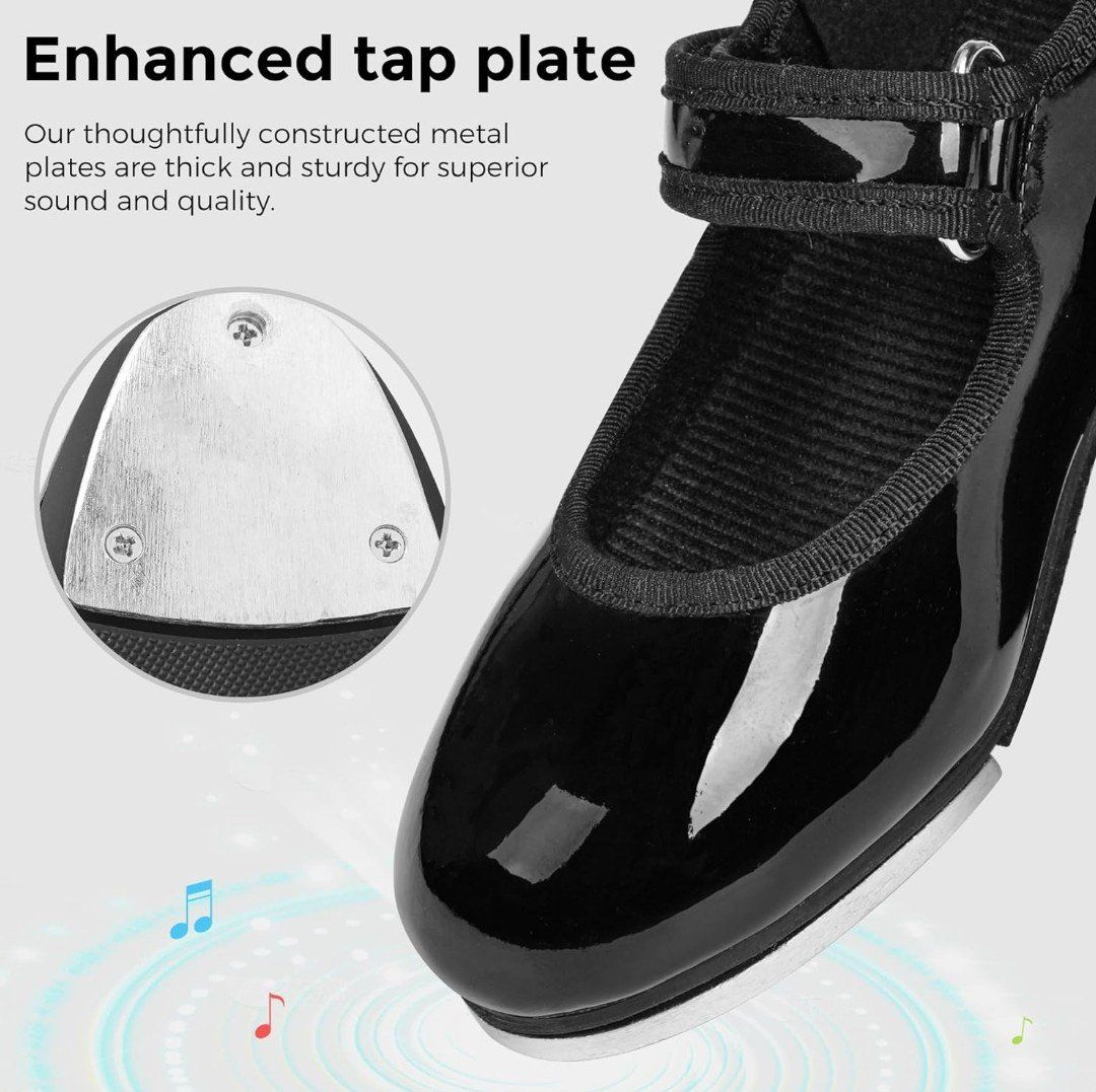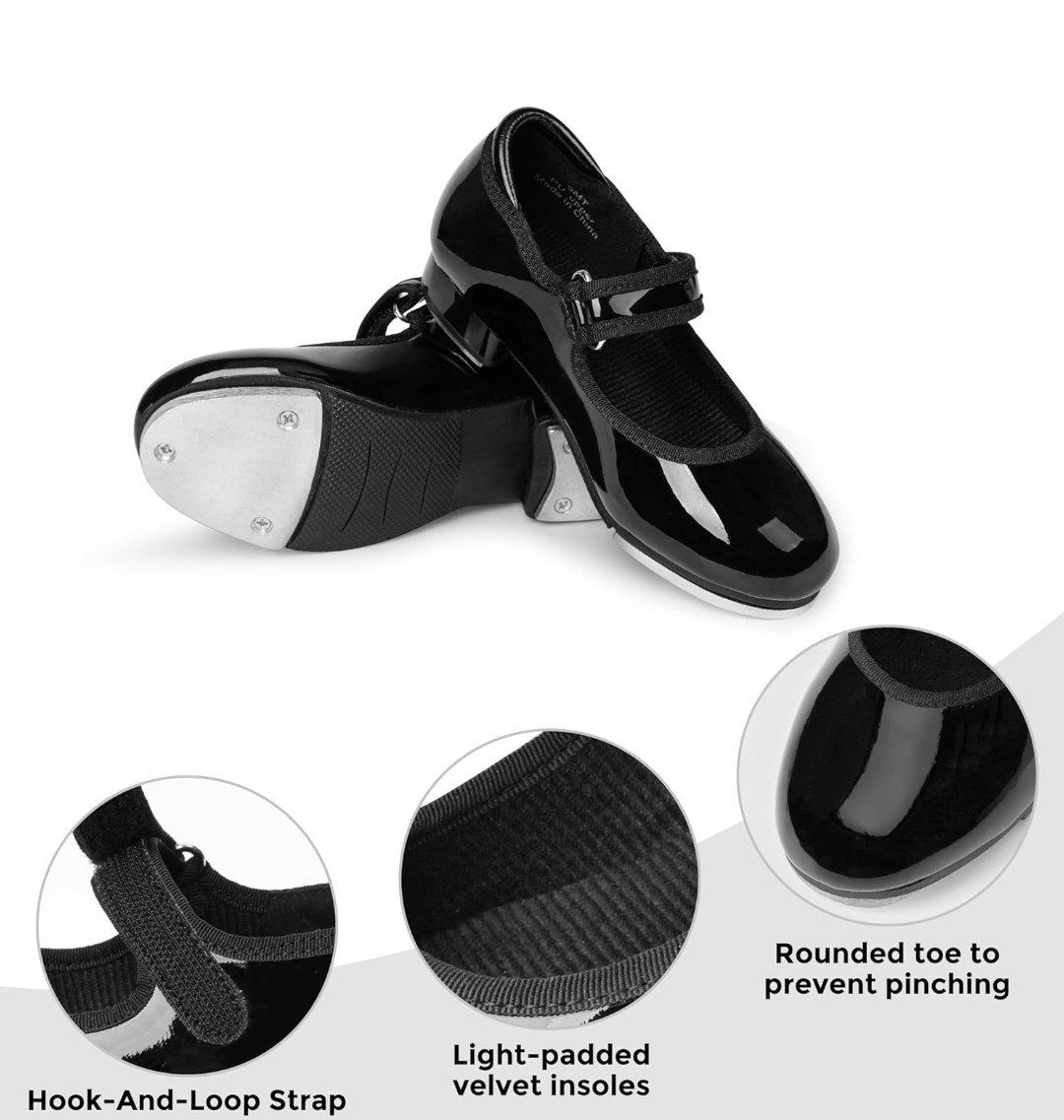 Stelle Dance Tap Shoes for Toddler, PU Leather. Sophisticated Dancing Style. Feature a simple strap closure that’s perfect for practices or performances. Thoughtfully Constructed Design: for girls and boys. The shoe tops are high-quality PU leather that wipes clean with a damp cloth. included comfortable touches like a rounded toe to prevent pinching and a padded heel collar to protect against chafing and damage to the Achilles tendon. toddler tap shoes has a cushioned insole for shock absorption. Top-Quality Soundboards and Soles: Your child will always be able to dance confidently, thanks to the careful sole and soundboard design of these boys' and girls' tap shoes. The manufactured sole provides premium traction and a long-lasting, non-slip grip. also enhanced soundboards with a thick iron plate that’s sturdy yet light on your child’s feet! This is screwed directly into the tap for durability, and each step produces beautiful tapping sounds! Hook-And-Loop Strap: kids' tap shoes are a breeze to take on and off with hook-and-loop strap closures! The adjustable straps securely fasten the shoes, and your child will never have to worry about tripping on laces or tying their shoes. shoes fit true to size, so be sure to measure your child’s foot and reference size chart.