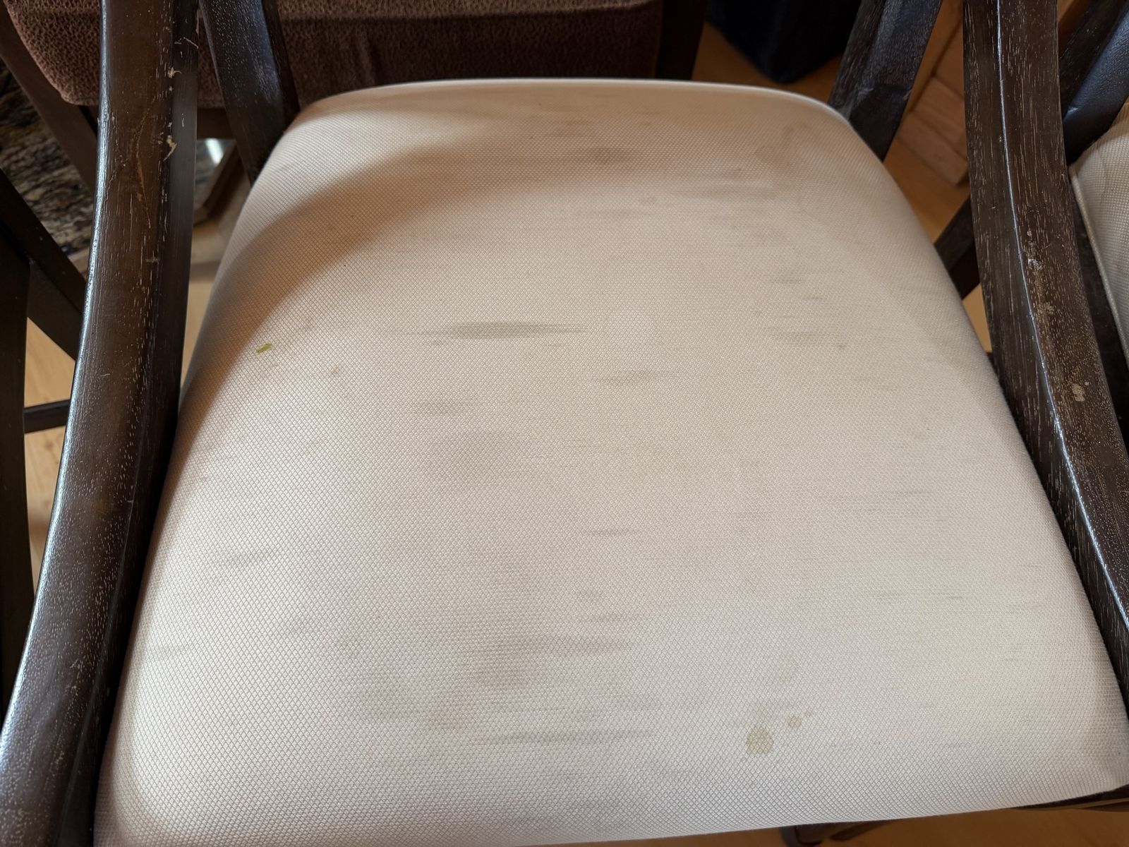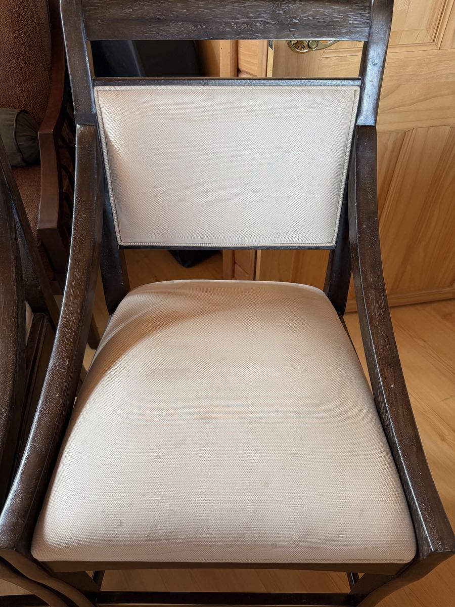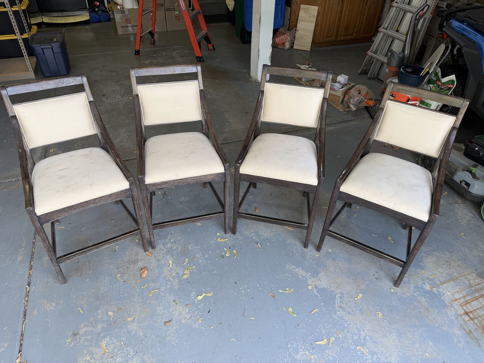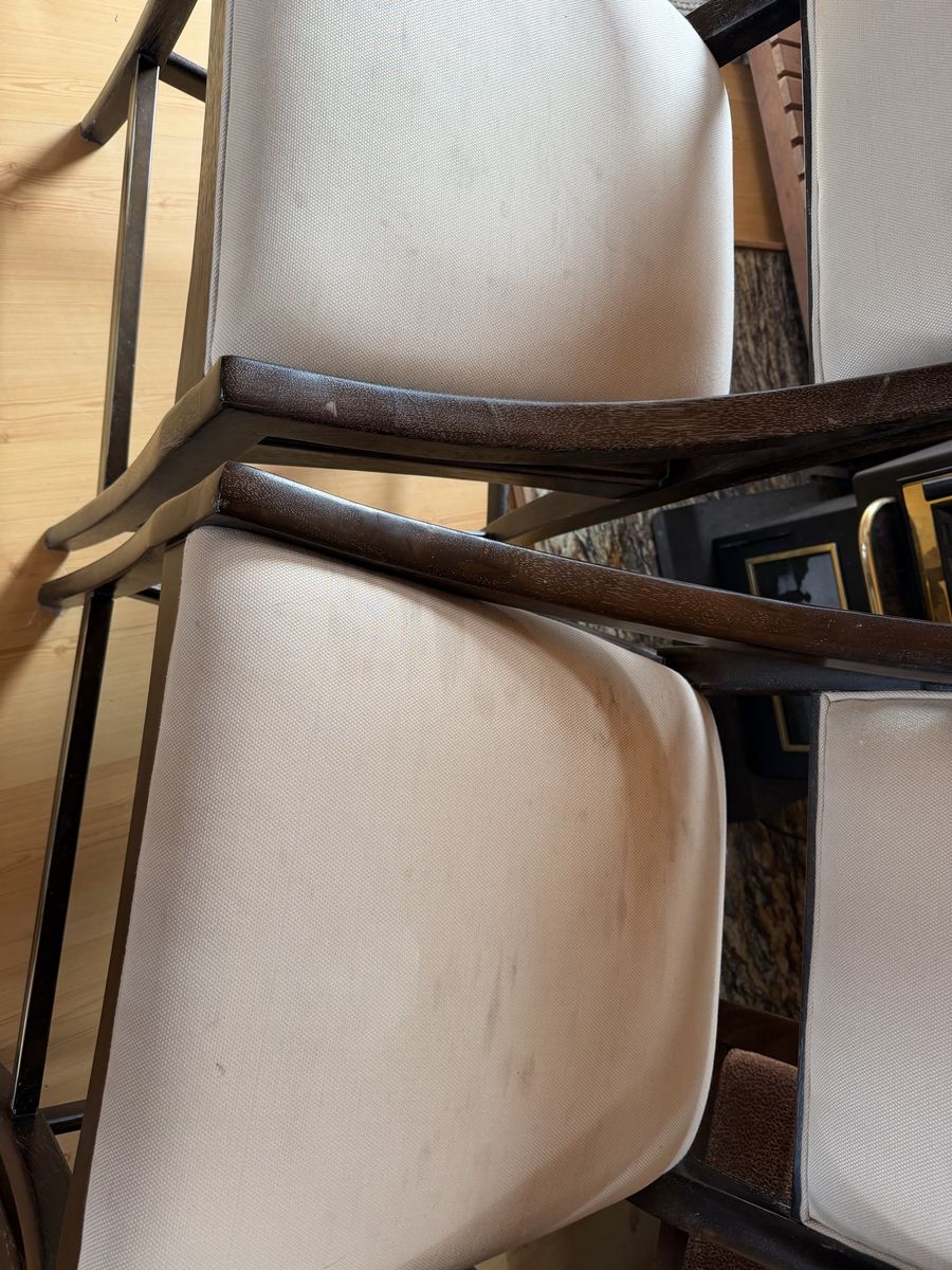 VenmoPadded bar stool chairs. Height: 23.5” to seat/arm (front); 39.25” at back. Depth: 22” at top and bottom; 18.5” at center. Width: 21” at front; 17.25” at back. Seats have some stains. Priced and sold as a set.