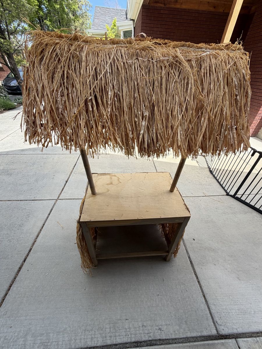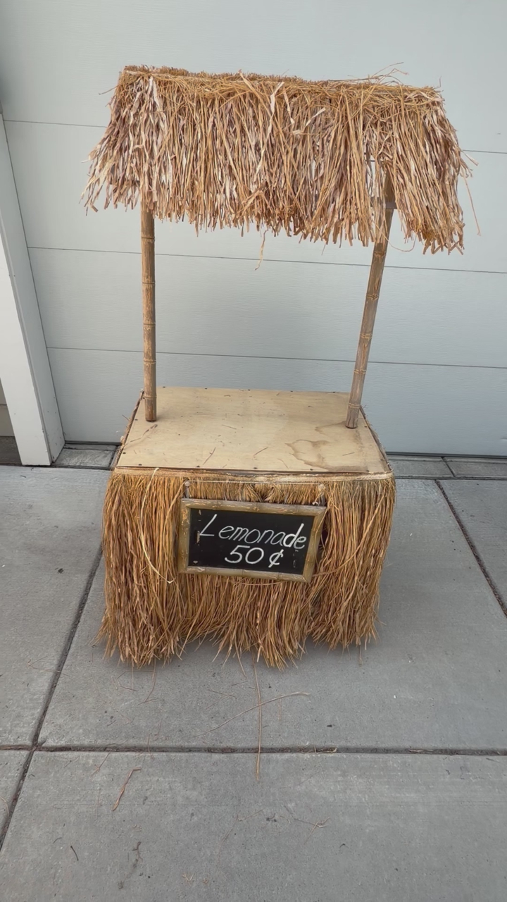 Real grass skirt trim pieces around table and roof (Industrial strength VELCO keeps in place!) Bamboo framed chalk board hangs from pegs (writable area-13.5 inches by 8.5 inches) Open Back for storage. Can be disassembled