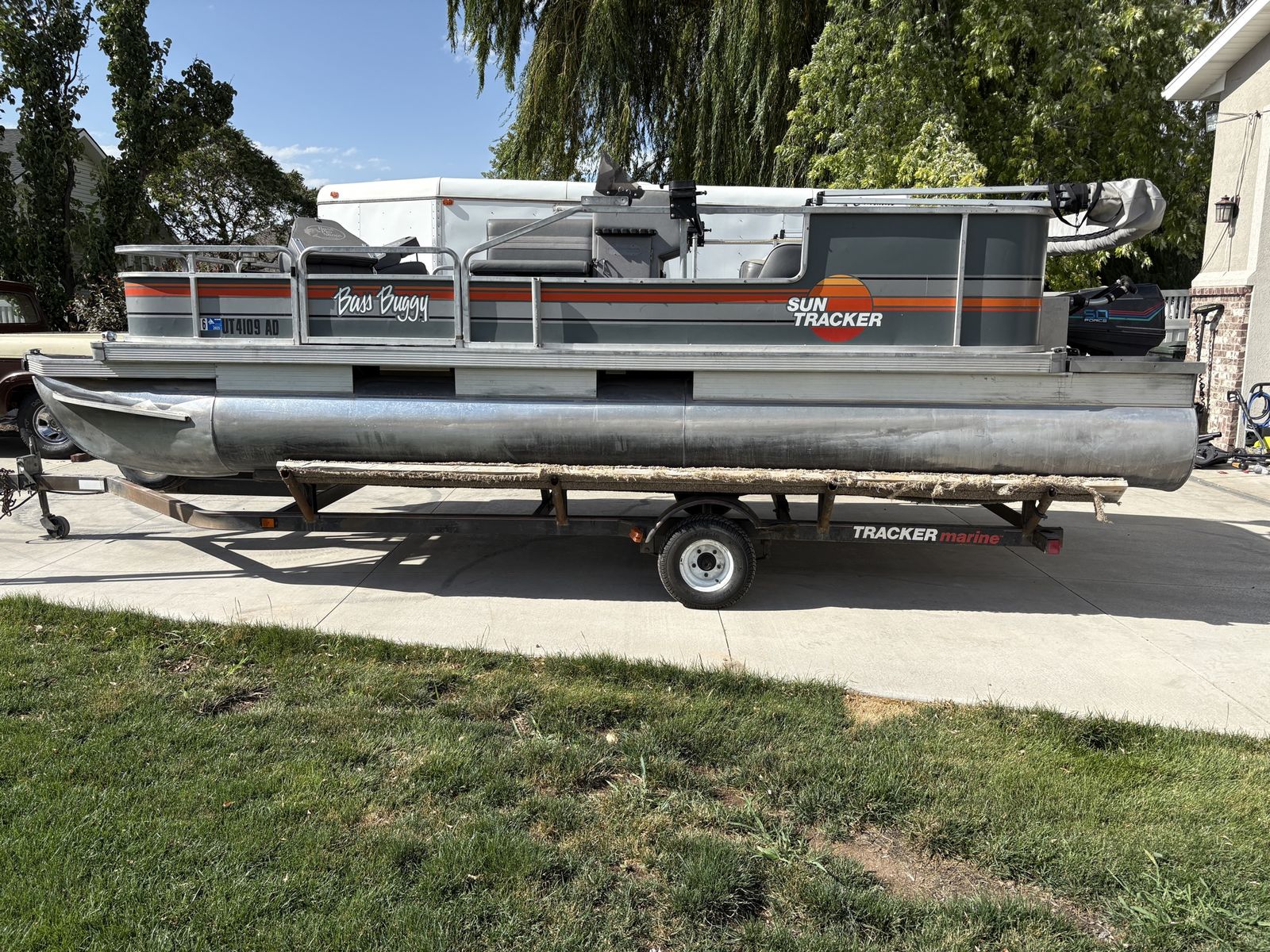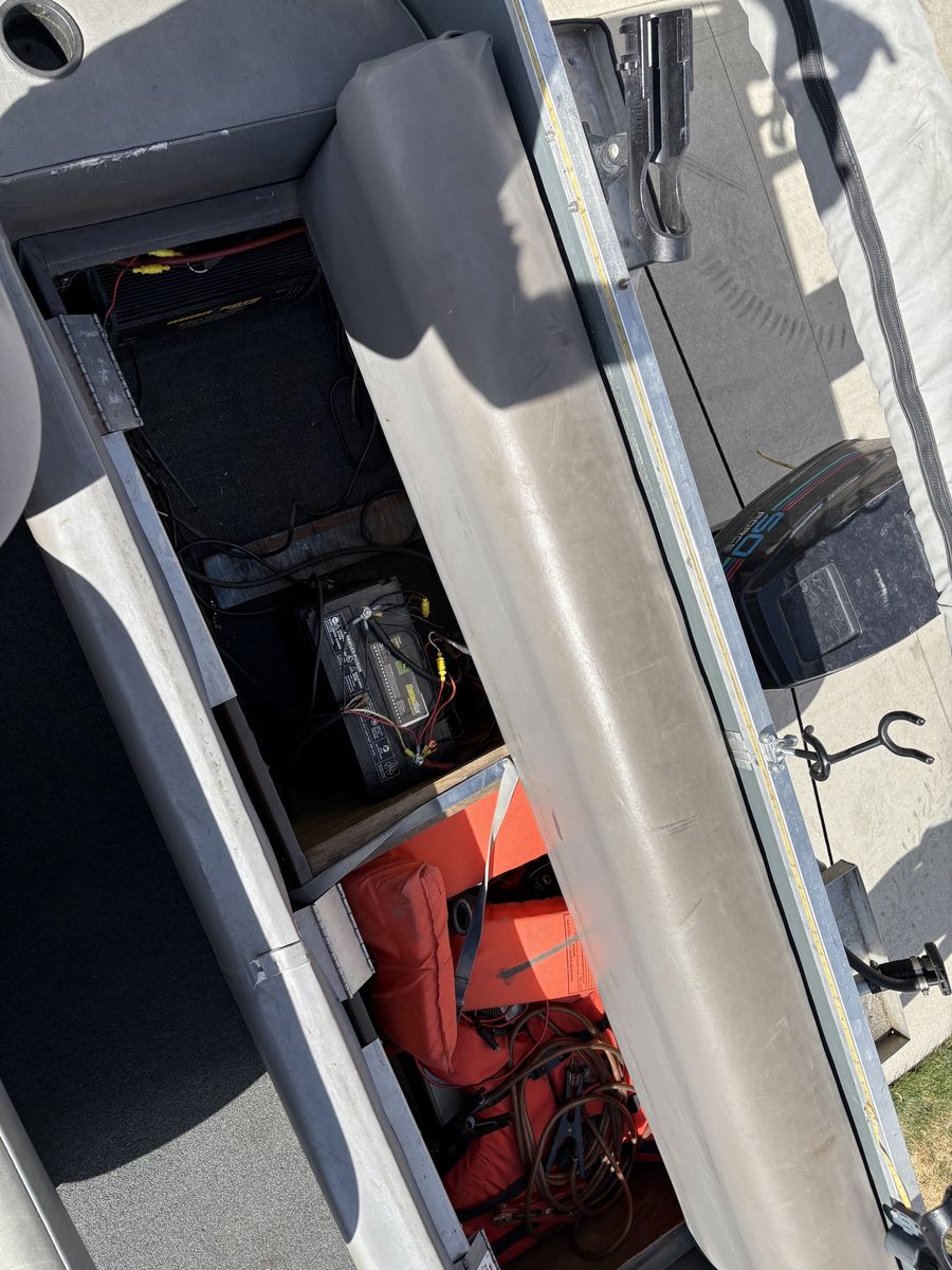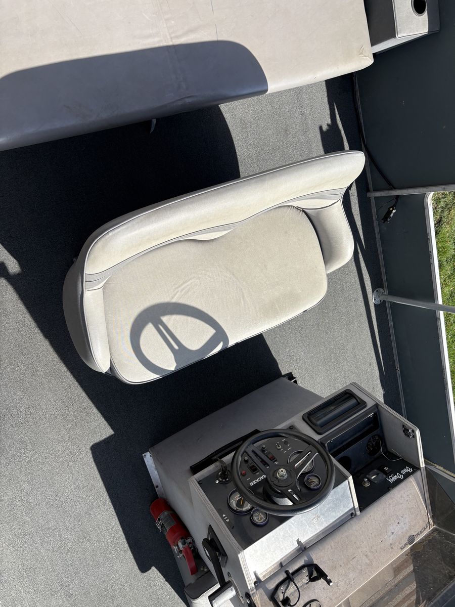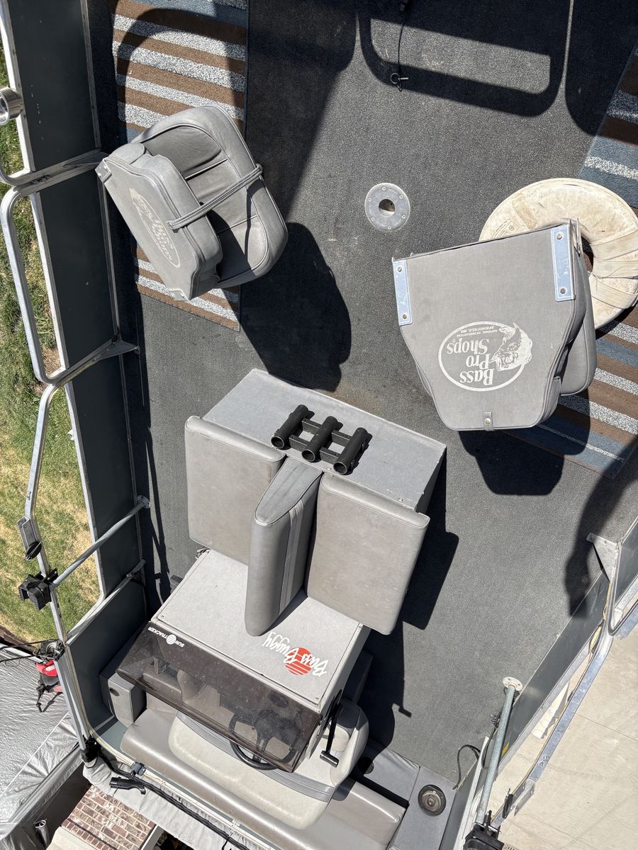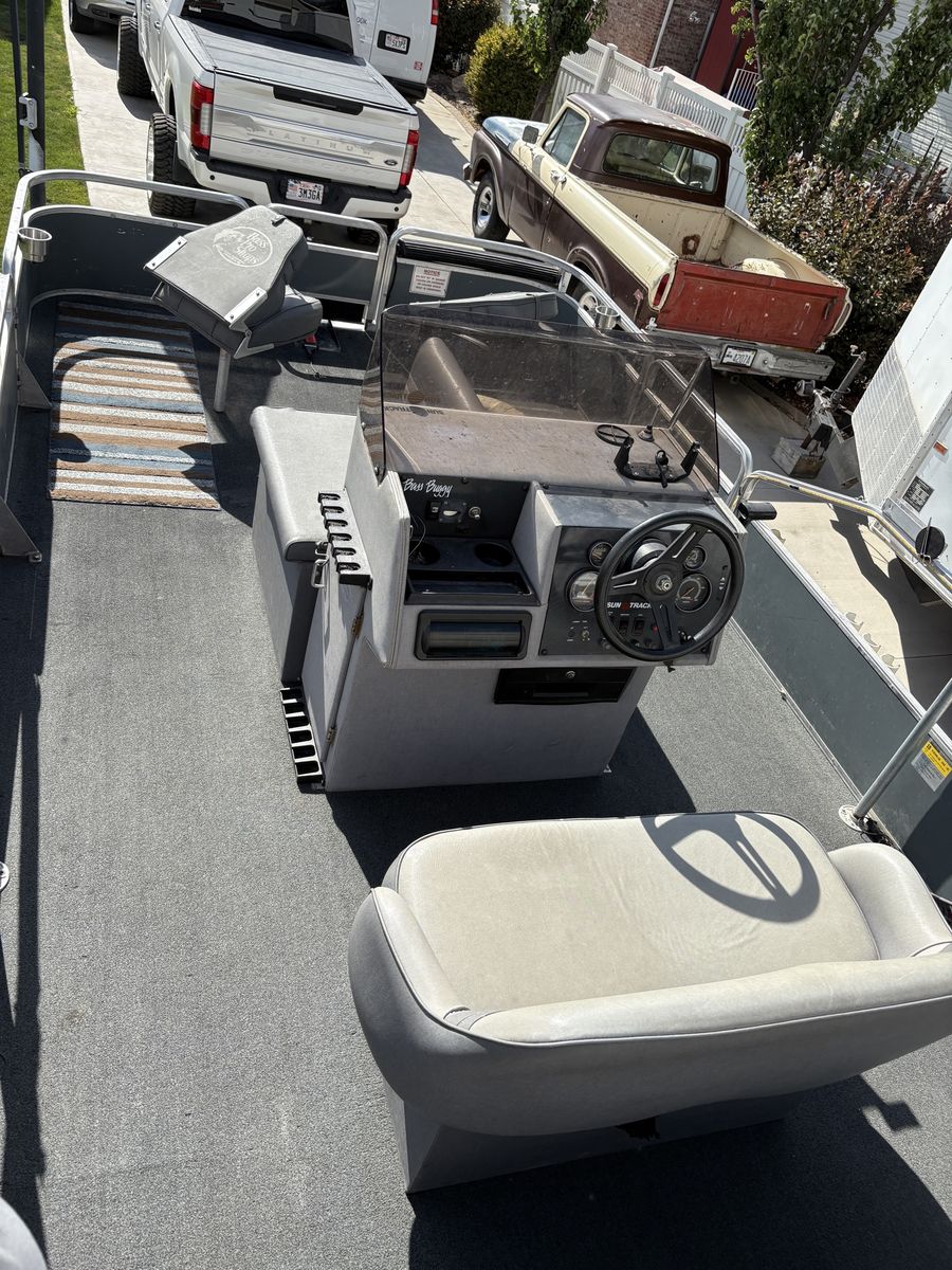 1988 Bass Buggy by Sun Tracker pontoon boat. Fantastic for fishing, lounging and cruising the lake. It is equipped a 50 hp Force motor with a 24 volt electric Minnkota trolling motor, down rigger mounts, radio, sunshade and anchor. It’s ready to hit the lake.