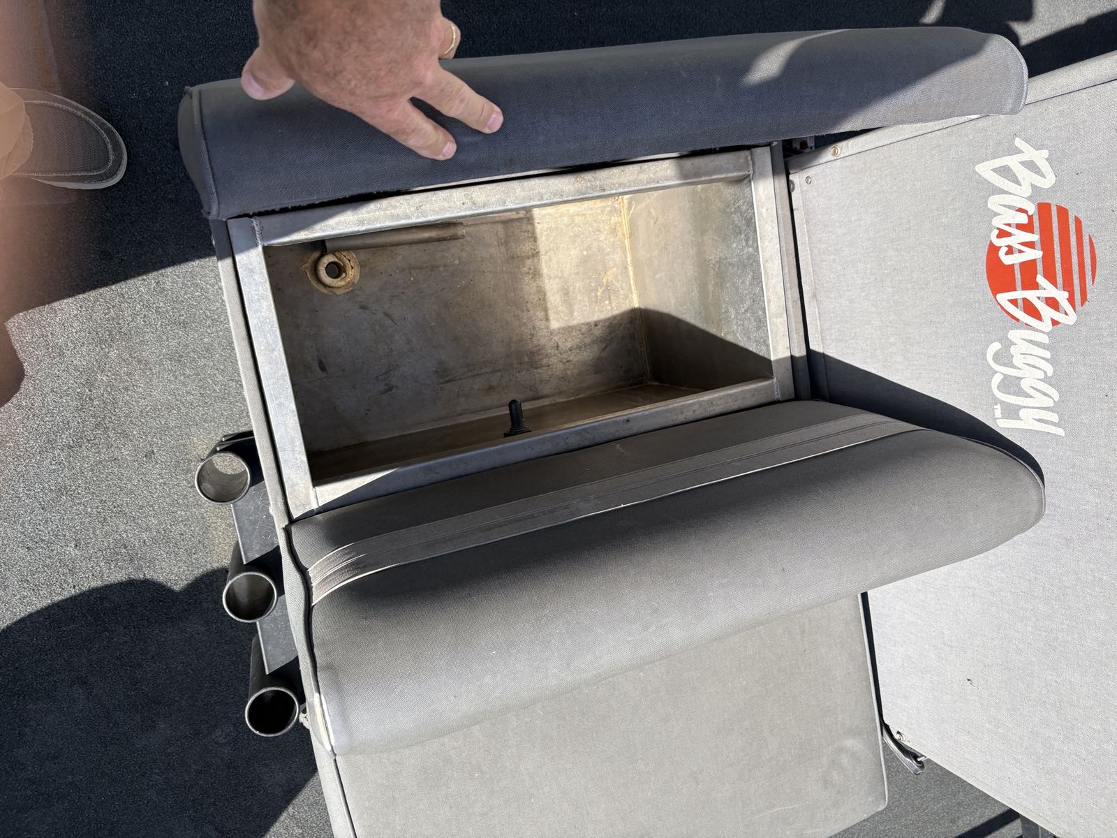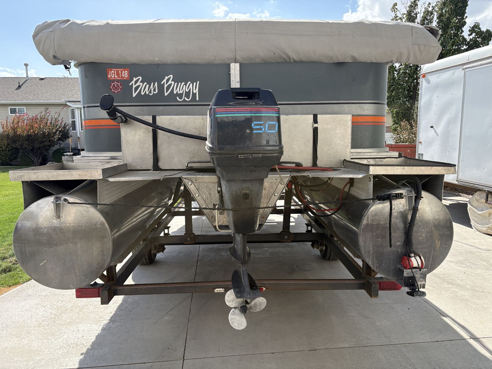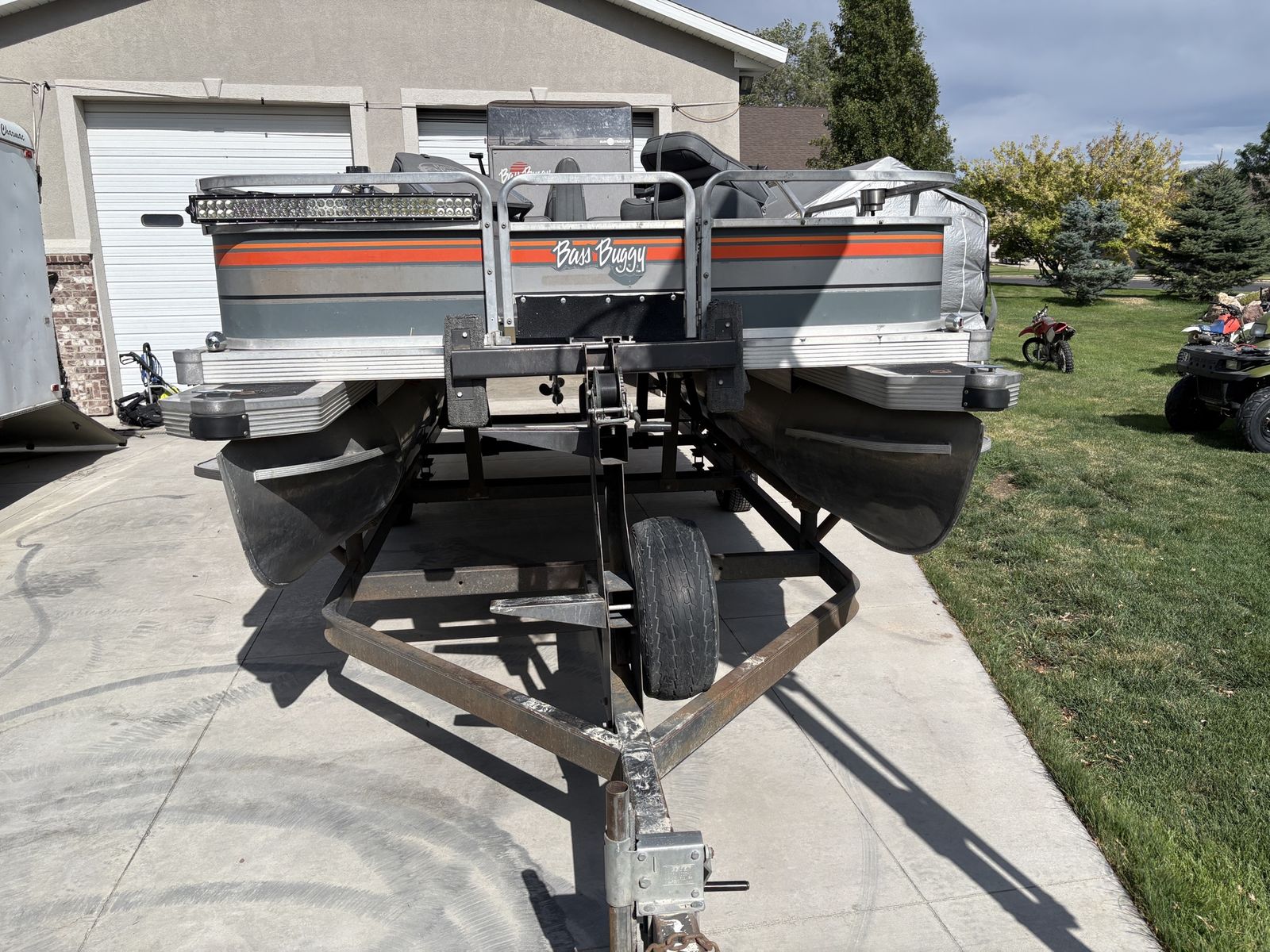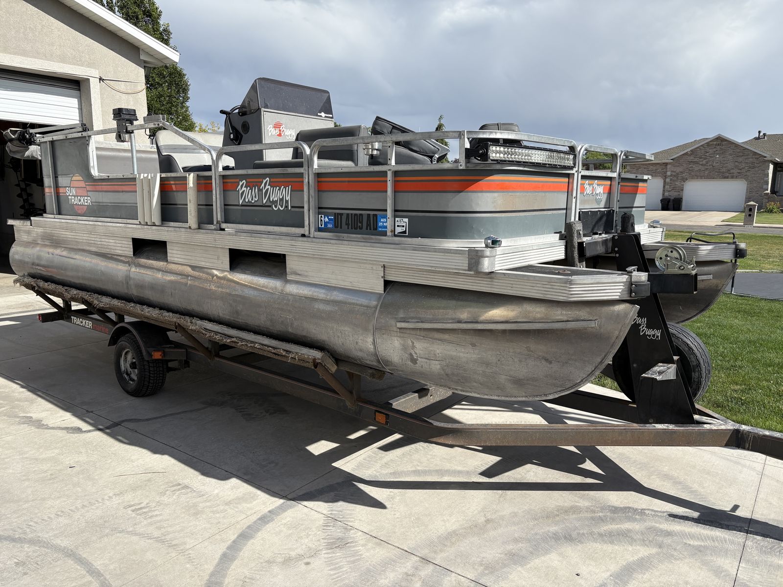 1988 Bass Buggy by Sun Tracker pontoon boat. Fantastic for fishing, lounging and cruising the lake. It is equipped a 50 hp Force motor with a 24 volt electric Minnkota trolling motor, down rigger mounts, radio, sunshade and anchor. It’s ready to hit the lake.