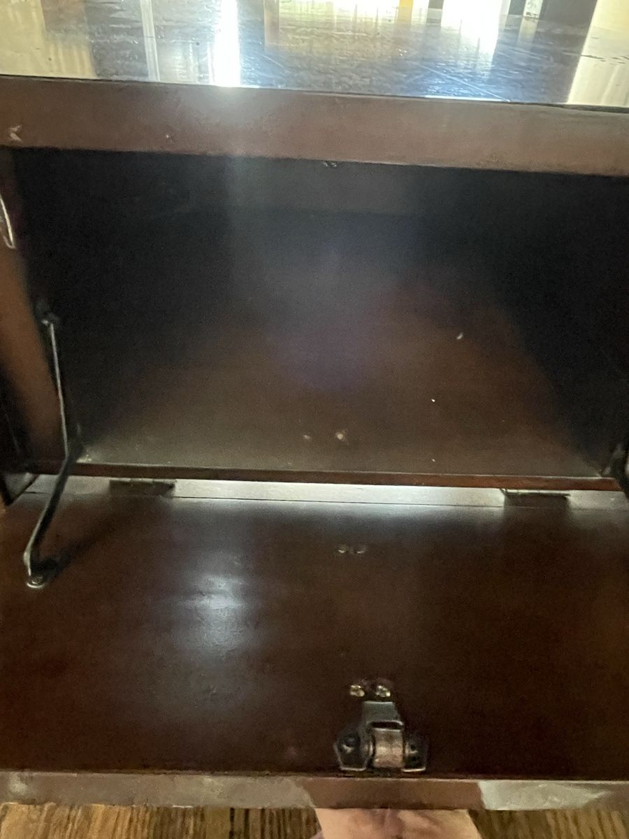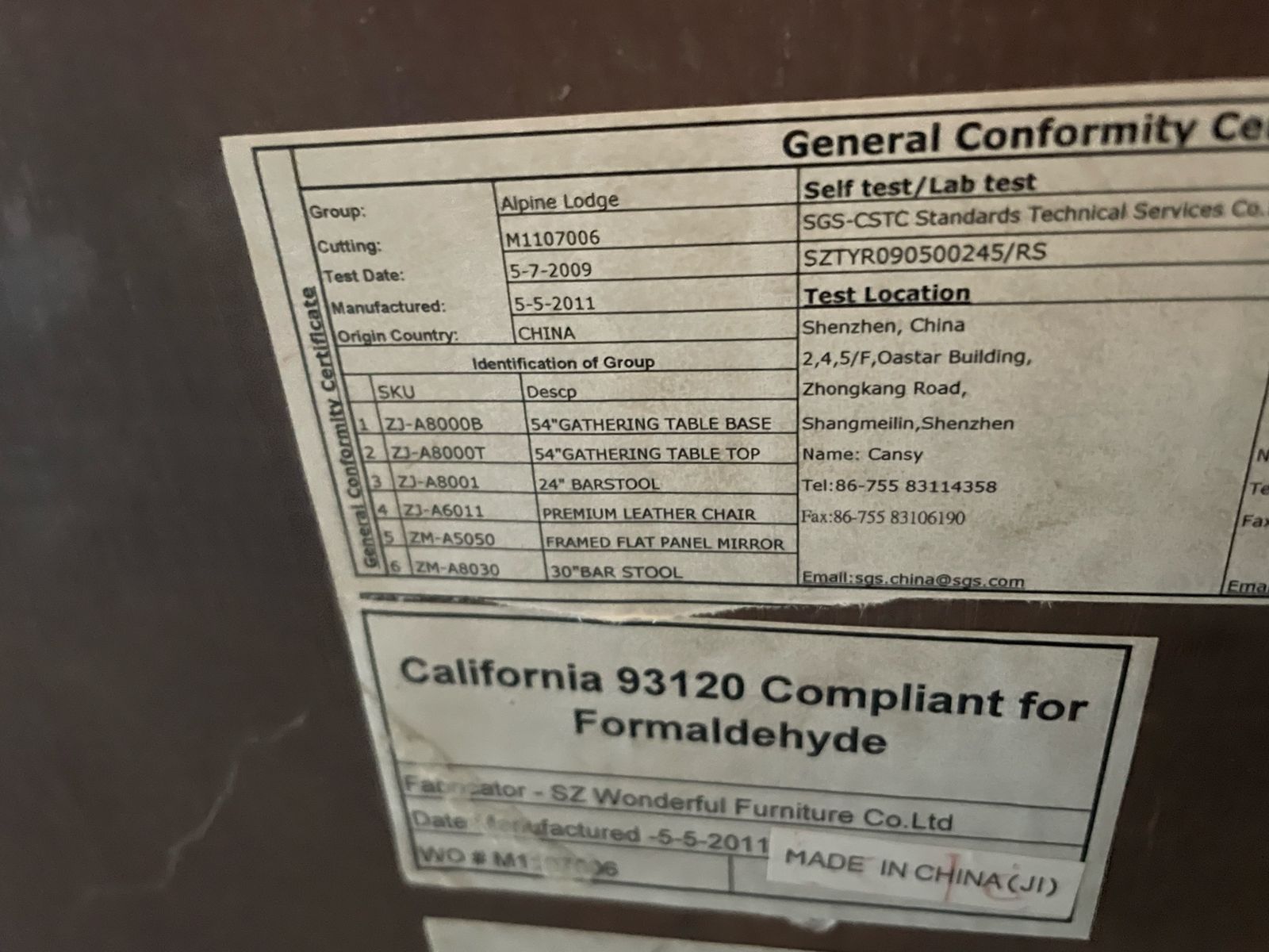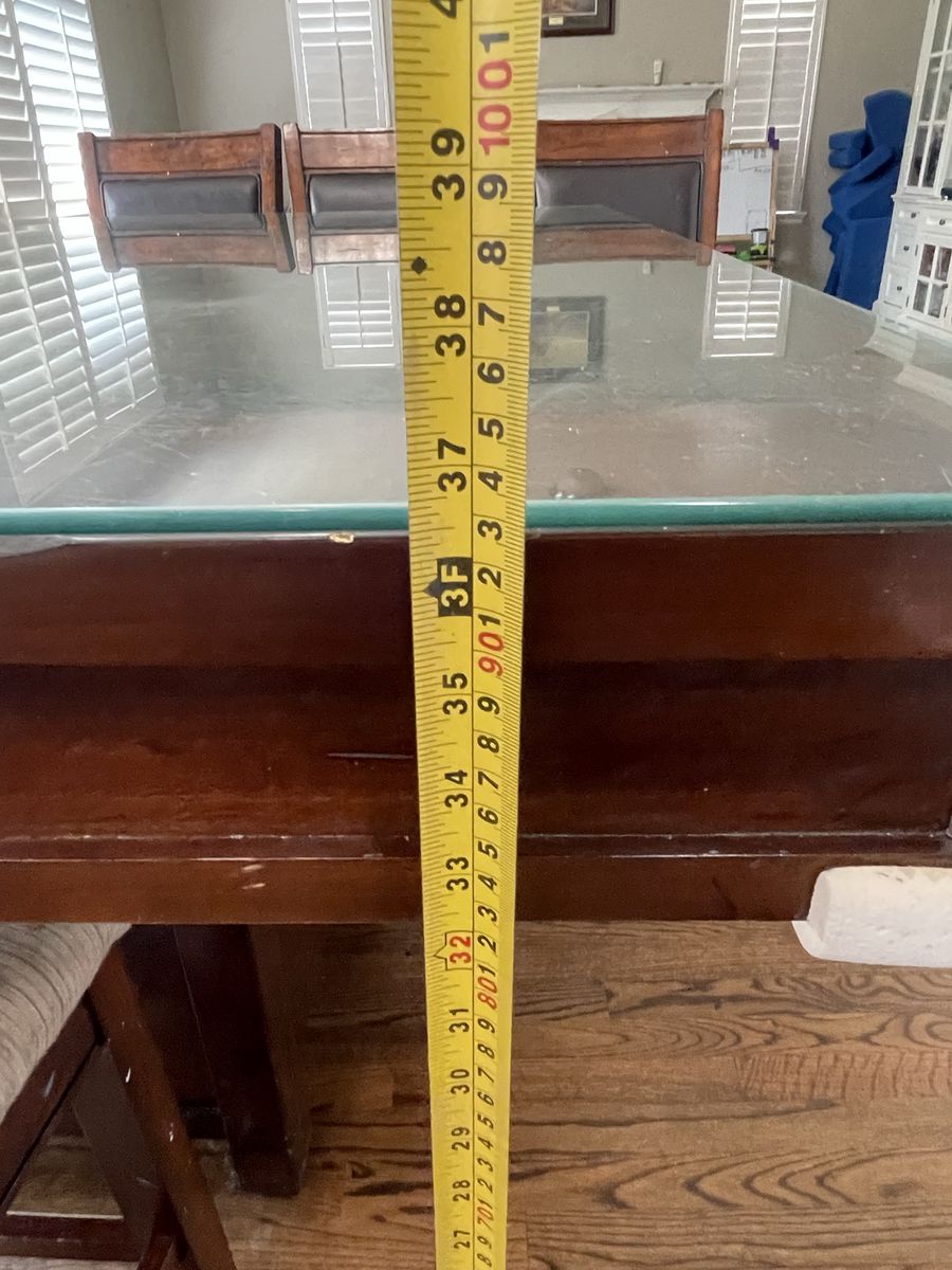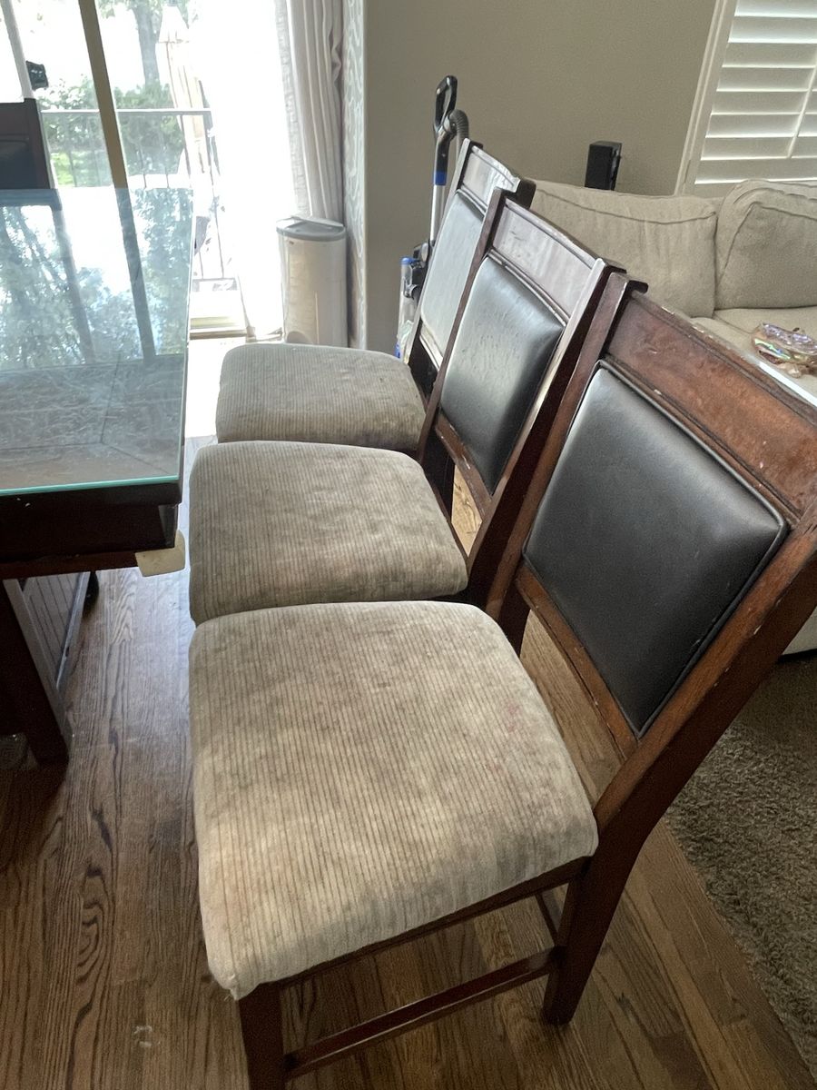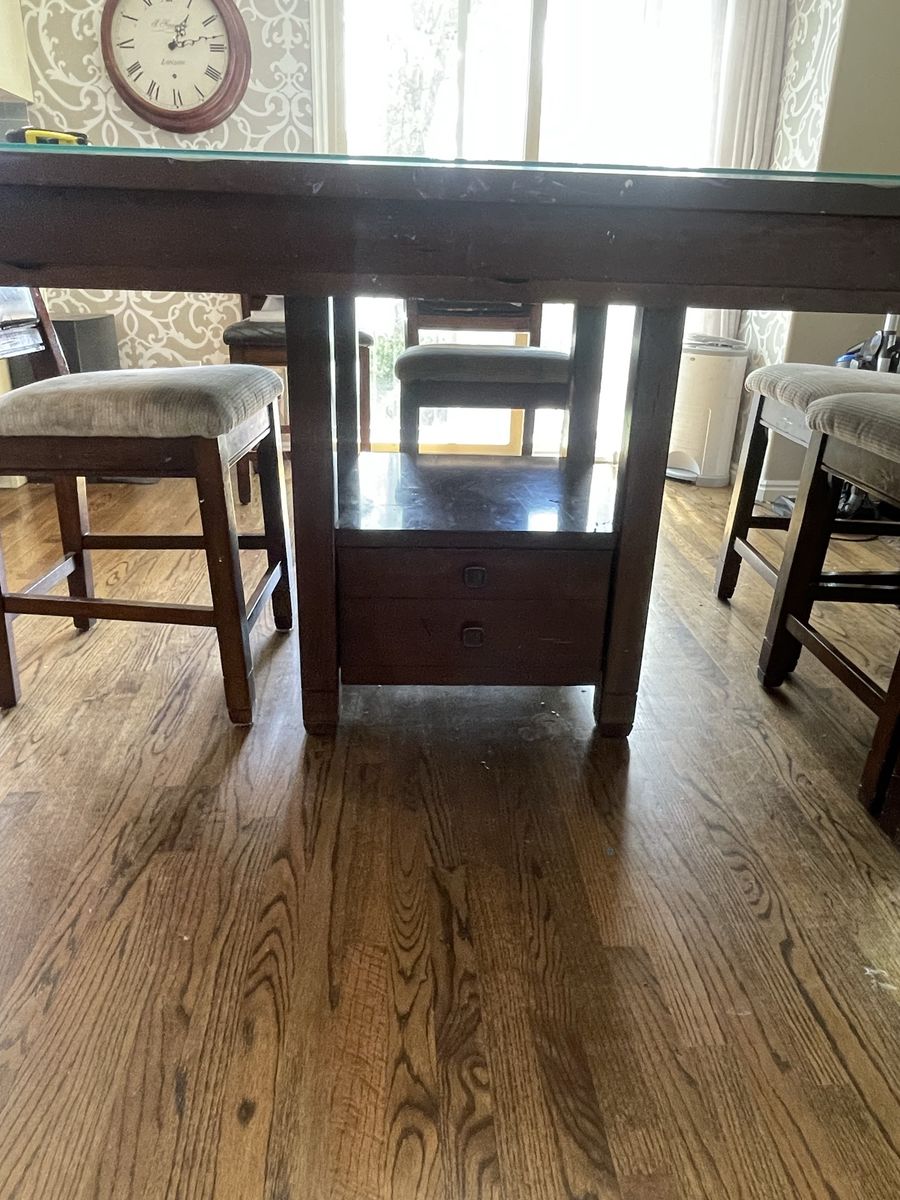 ApplePayAlpine Lodge 54” gathering (counter-height) dining table. Eight chairs. Comes with custom fitted glass table top. Chairs might need reupholstering. OBO