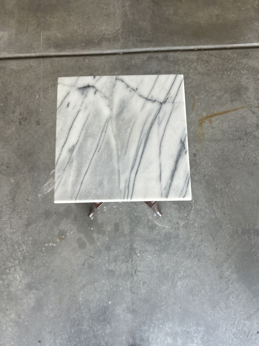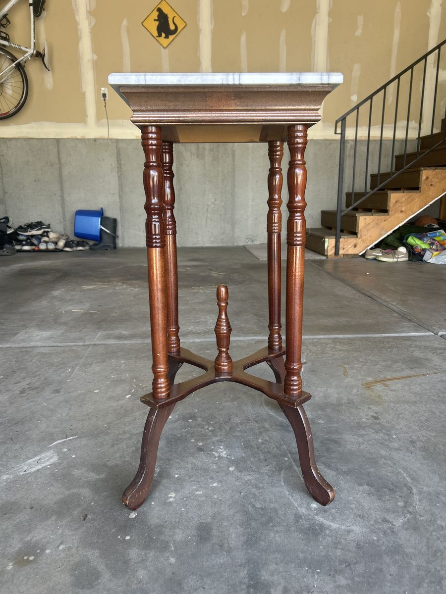 VenmoSolid marble top, dimensions are 29 1/2 inches tall, 14 inches wide. Wood is in great condition minima scratches