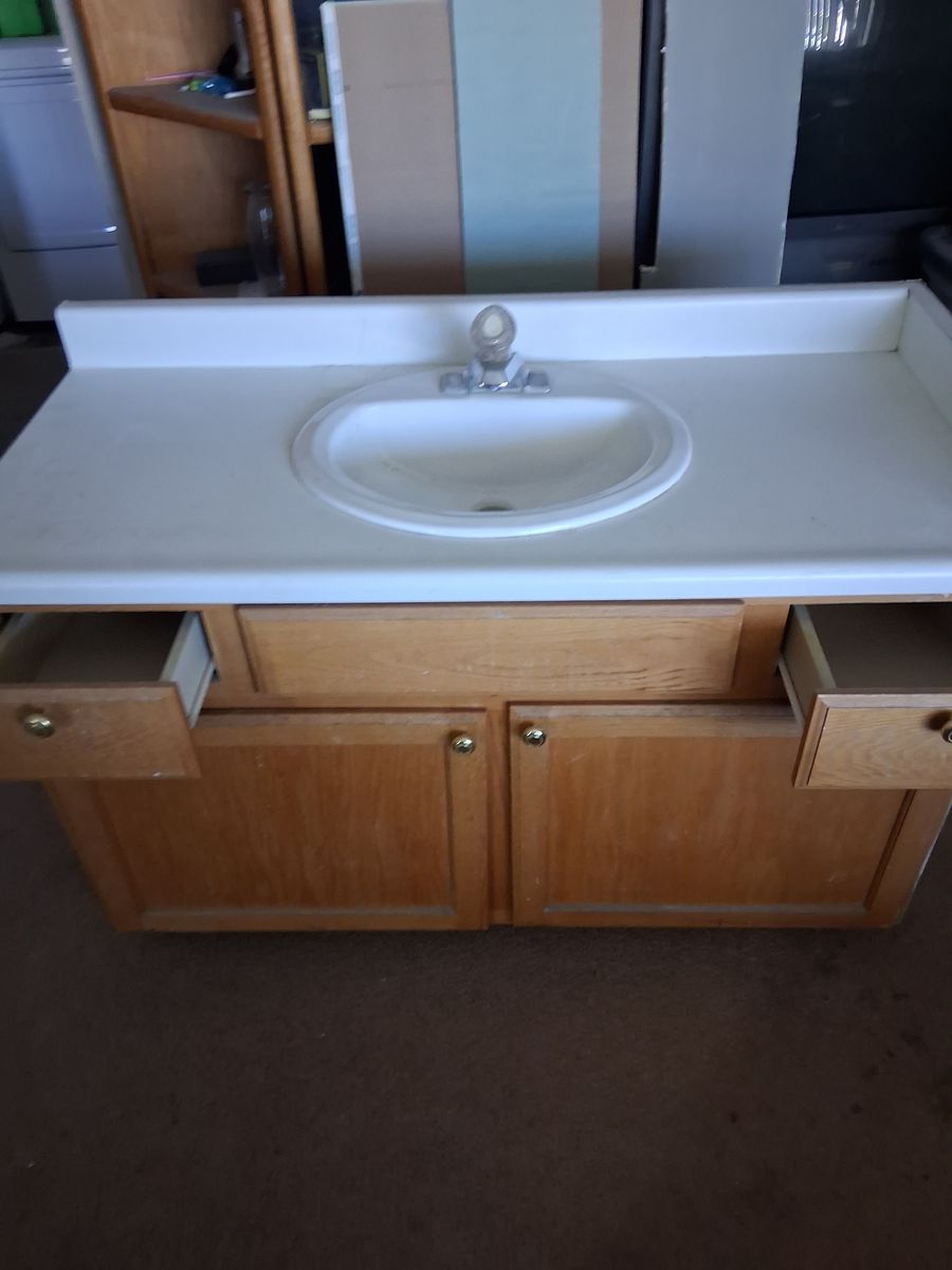 Venmo48" Bathroom Vanity with white top, sink and facet. Has 2 drawers in pretty good condition.