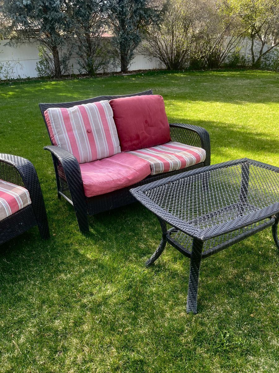 Wicker set comes with love seat, two patio chairs a glass table and cushions