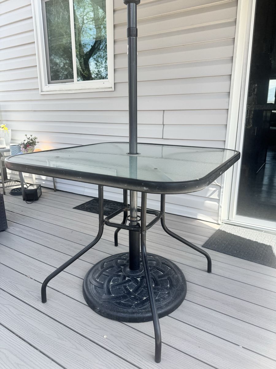Outdoor Glass Table. Umbrella and stand not included.
