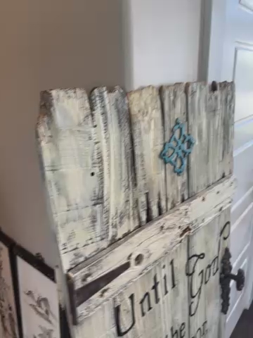 ApplePay58 1/2" H X 23 1/2" W old original barn wood. Vintage hinges, vintage nails and handle with aqua medallion at top. Hand made with stencil. One of a kind! $55 OBO