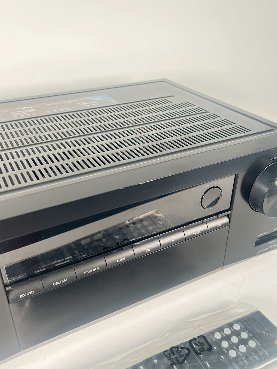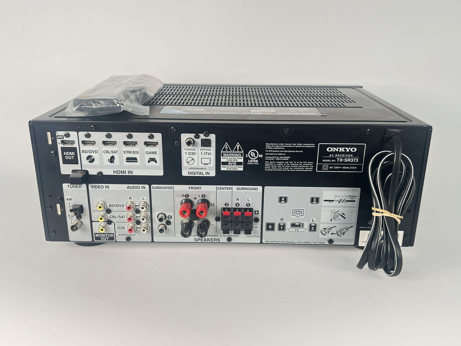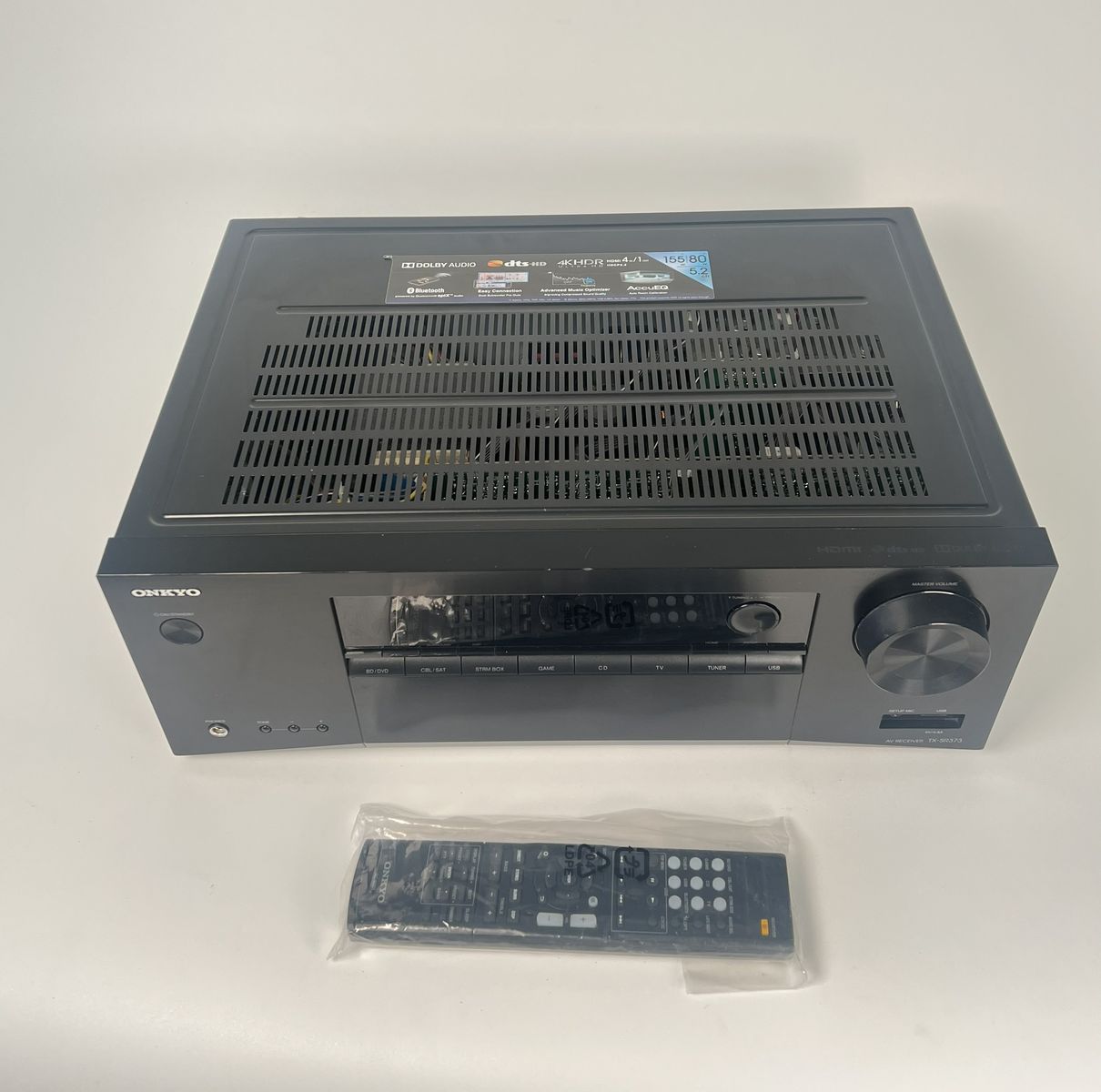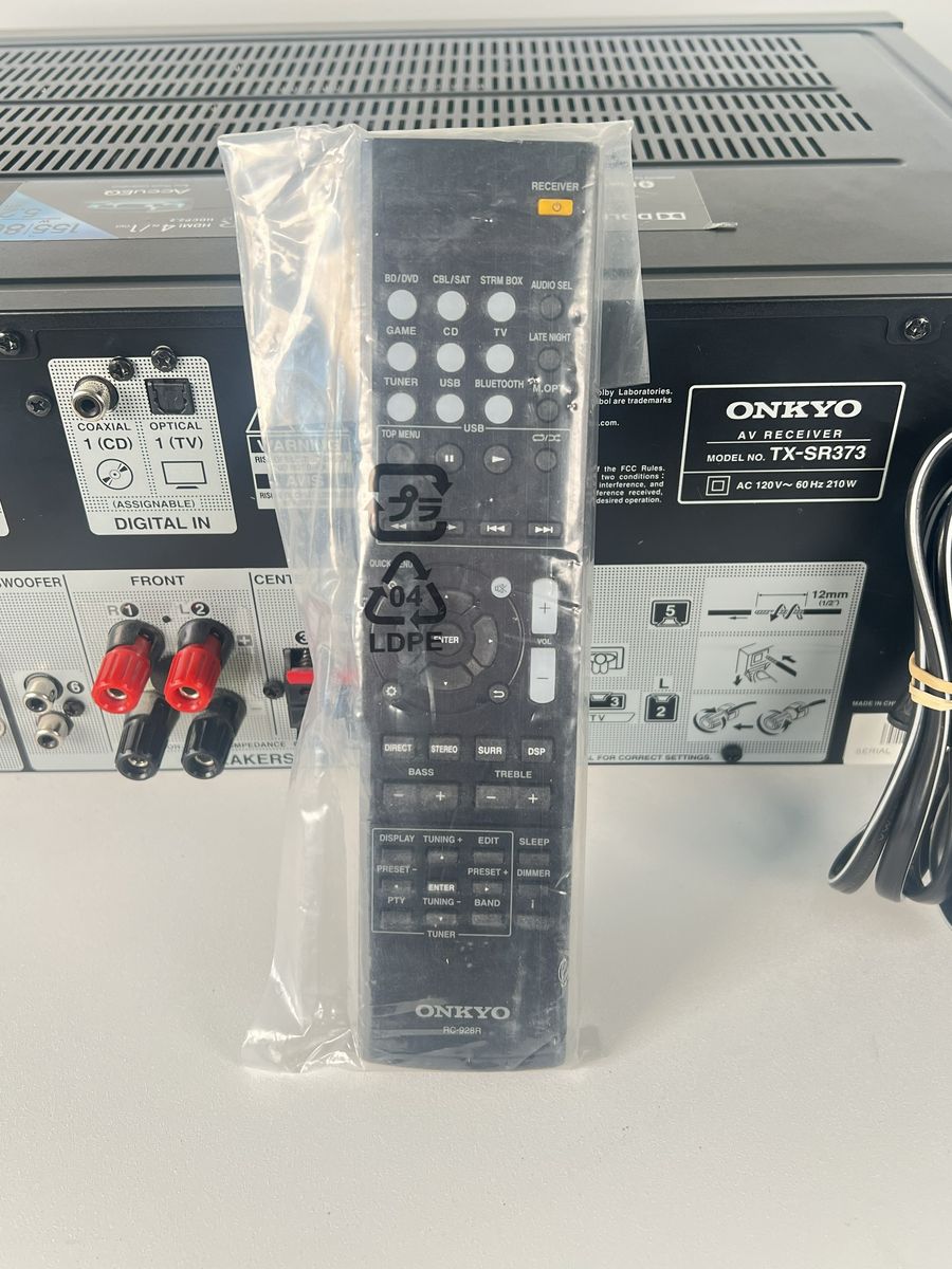 Onkyo TX-SR373 AV receiver in good used condition with light cosmetic wear from normal use. Includes original Onkyo remote (still in plastic) and attached power cord.