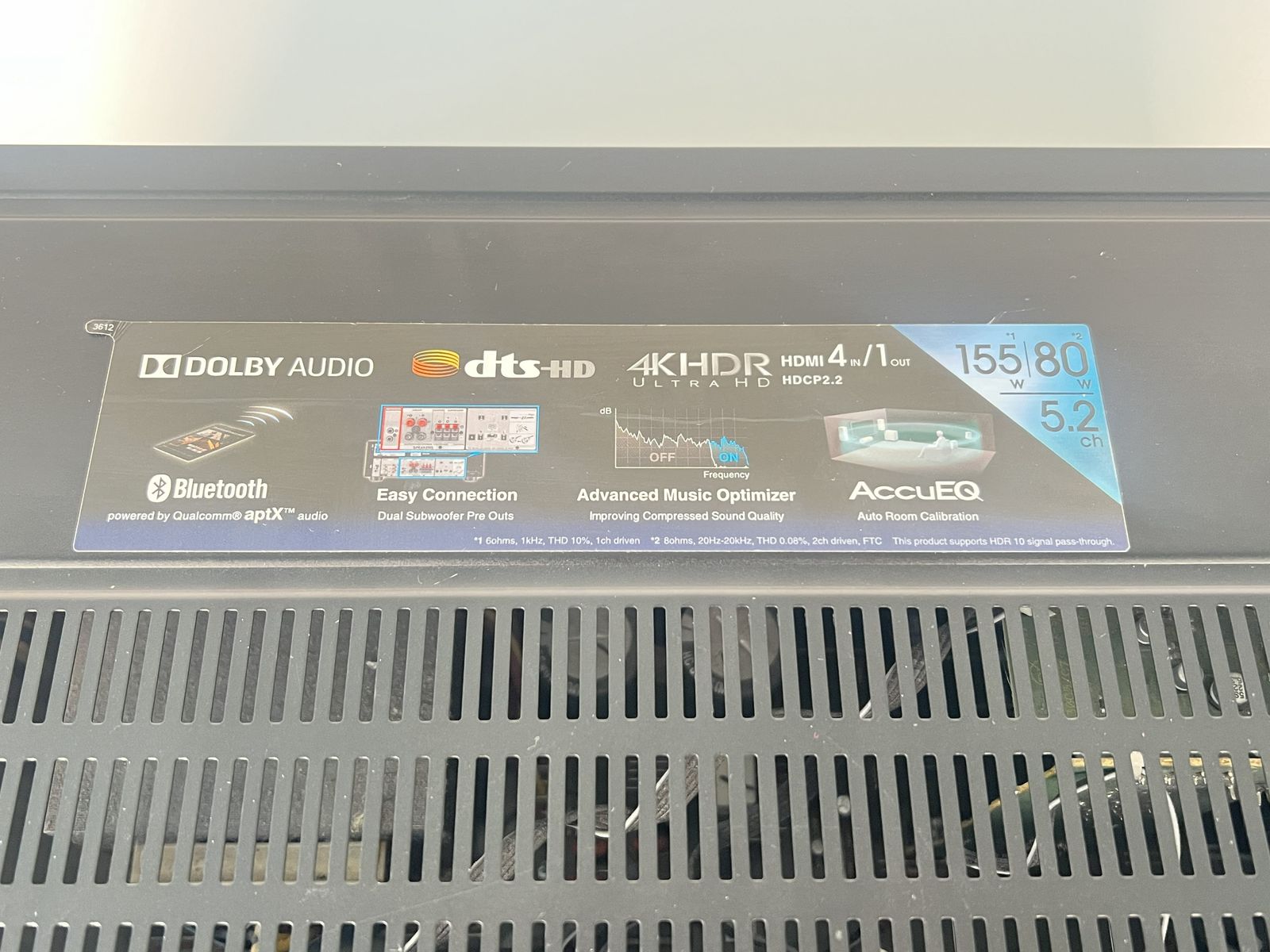This is a 5.2 channel receiver with dual subwoofer pre-outs. Supports Dolby Audio and DTS-HD decoding. Features standard binding post speaker terminals compatible with banana plugs. Includes a calibration mic input for AccuEQ room setup.