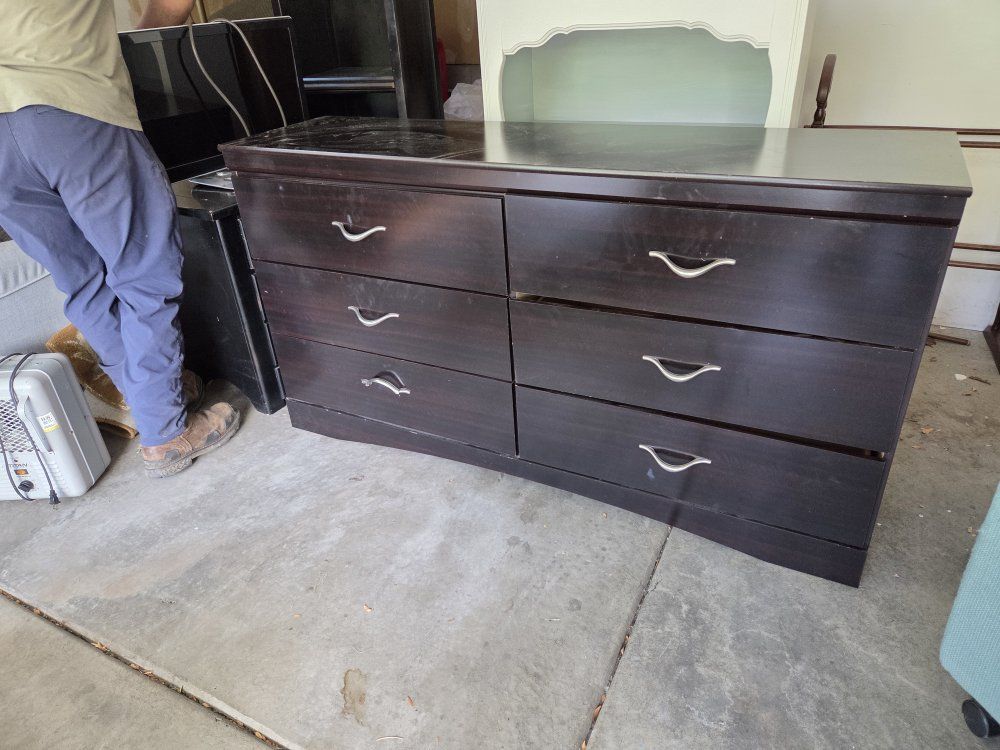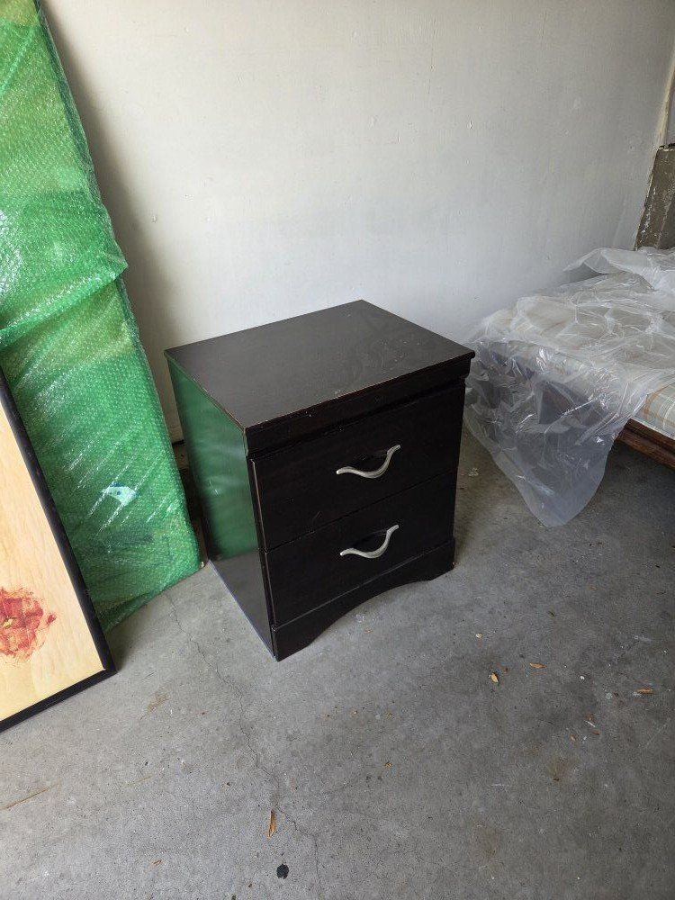 Black bedroom set, 2 night stands, dresser with mirror, headboard, footboard, rails for queen bed.