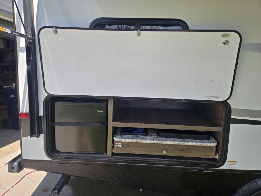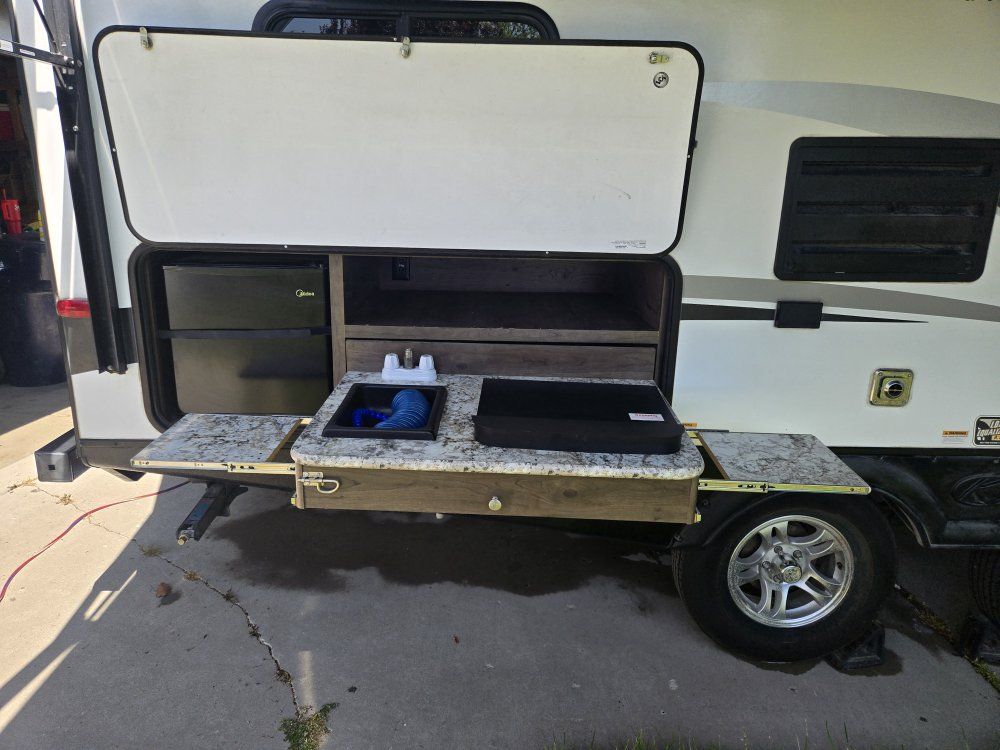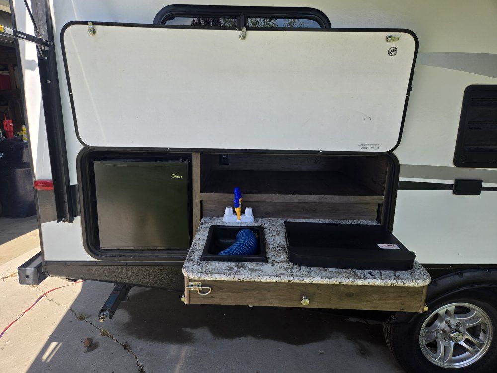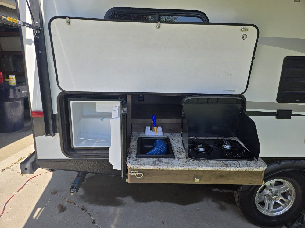· Outside kitchen with 2 burner stove, sink, mini fridge