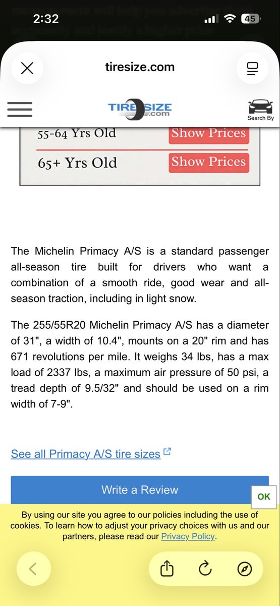 Venmo(4) 255/55 R20 Michelin Primacy A/S All-Season Tires. I measured the tread and got 8/32". Online sources say they have 9.5/32" brand new, so these have only been used lightly. Might be willing to deliver within Salt Lake or Utah county.