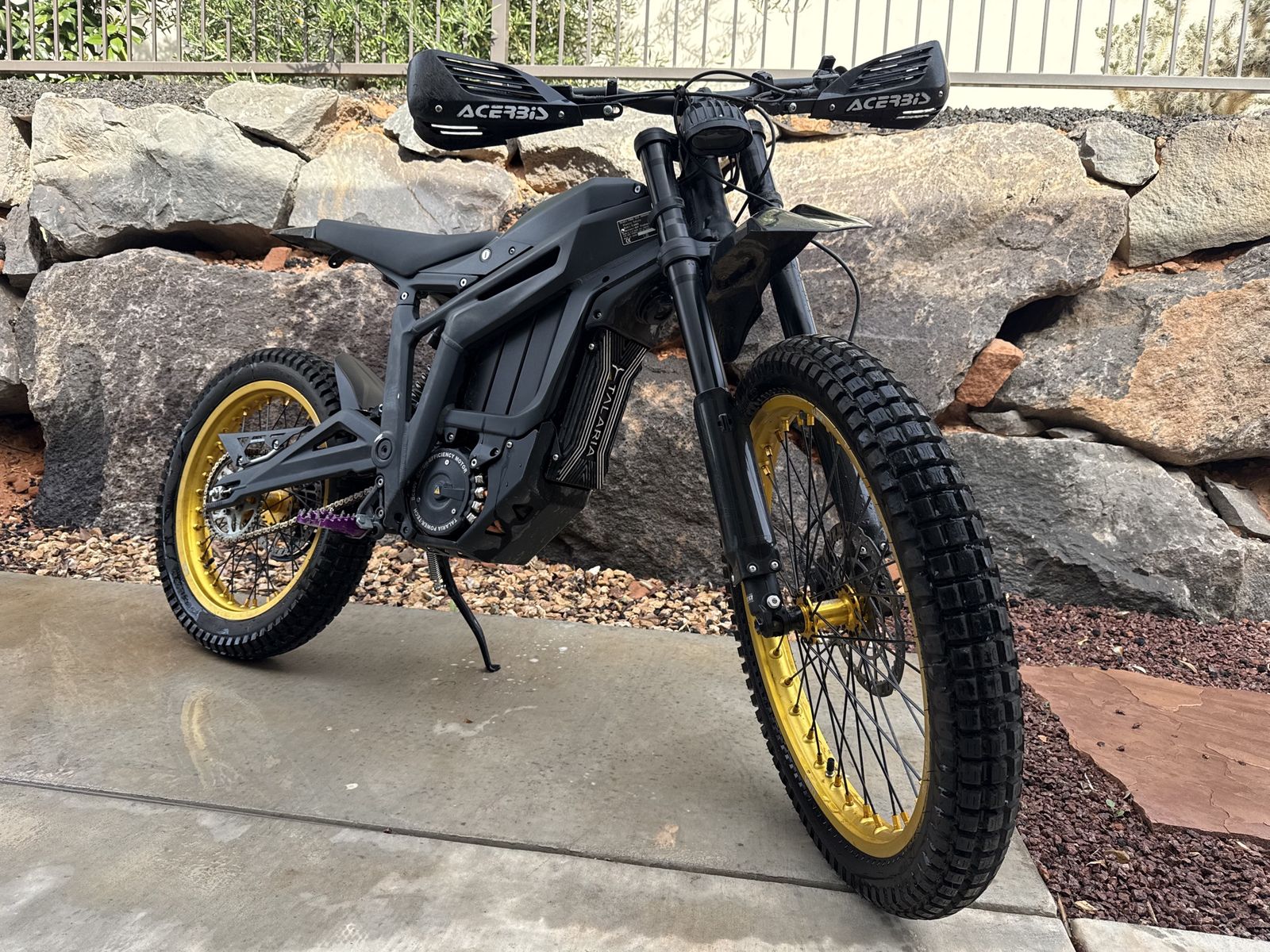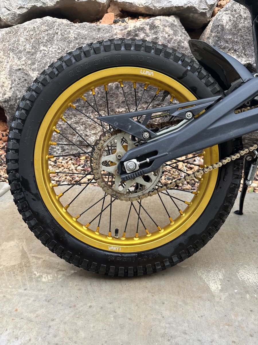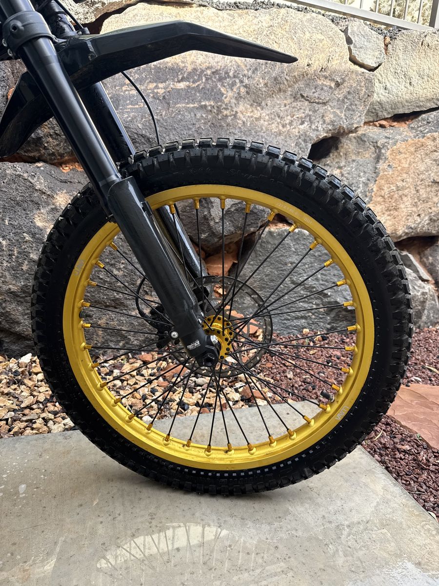 2023 Talaria MX4 with 21” Front and 19” rear moto wheels and sticky tires for great single track riding. Also includes nice foot pegs and moto brush guards.