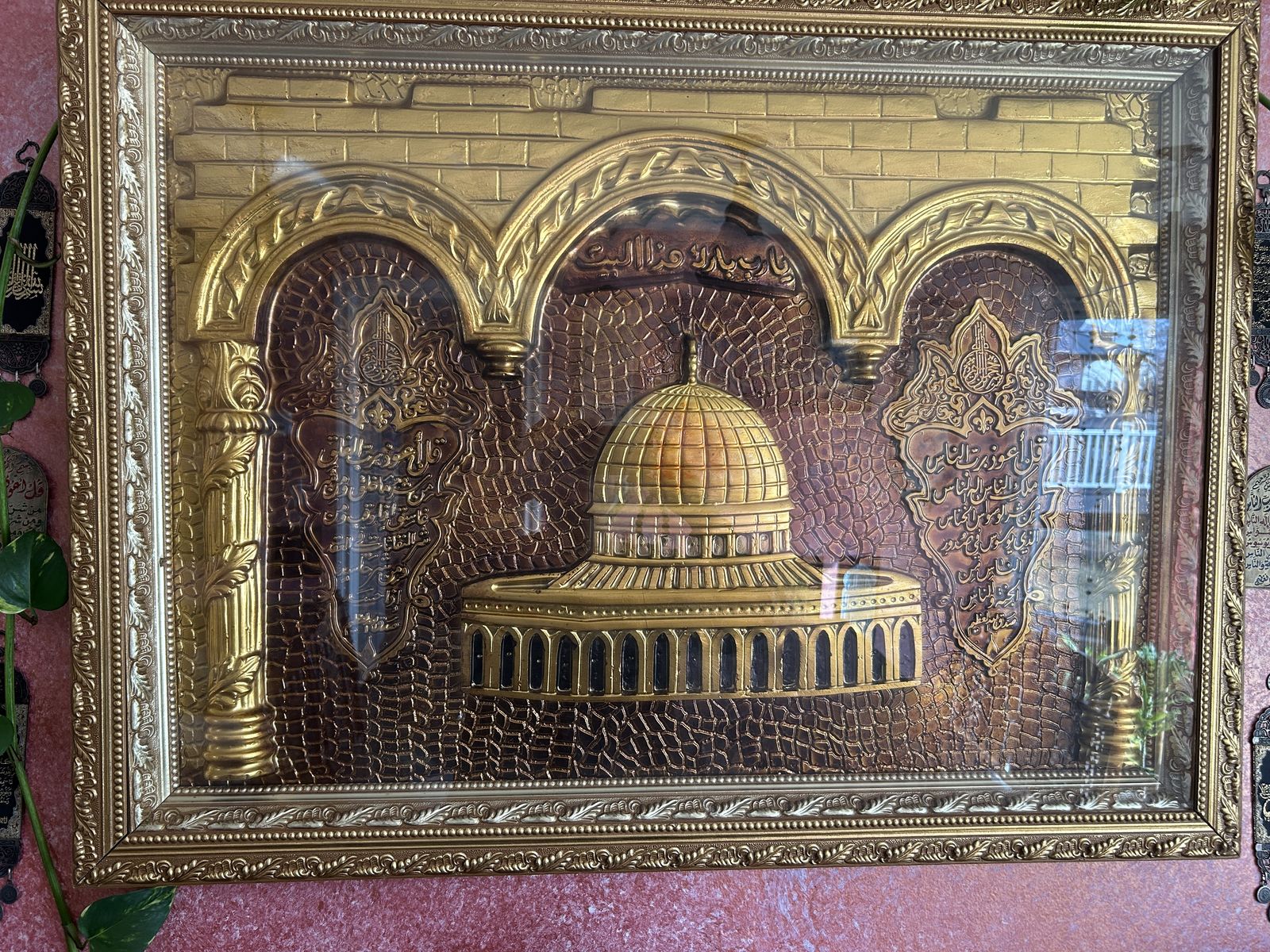Framed Islamic wall art featuring a detailed Dome of the Rock design with Arabic calligraphy on each side.