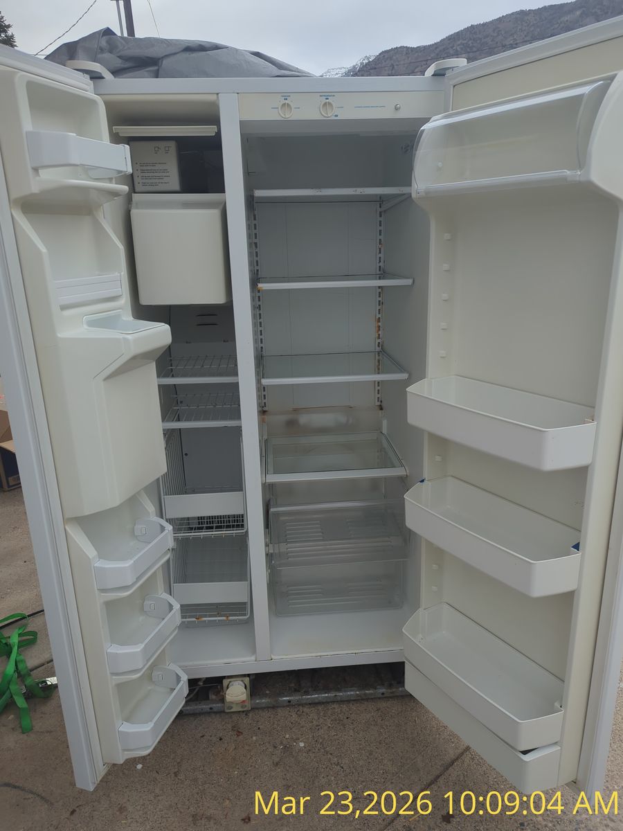 Used side-by-side doors, white refrigerator. Works great, just doesn't have door handles, still easy to open.
