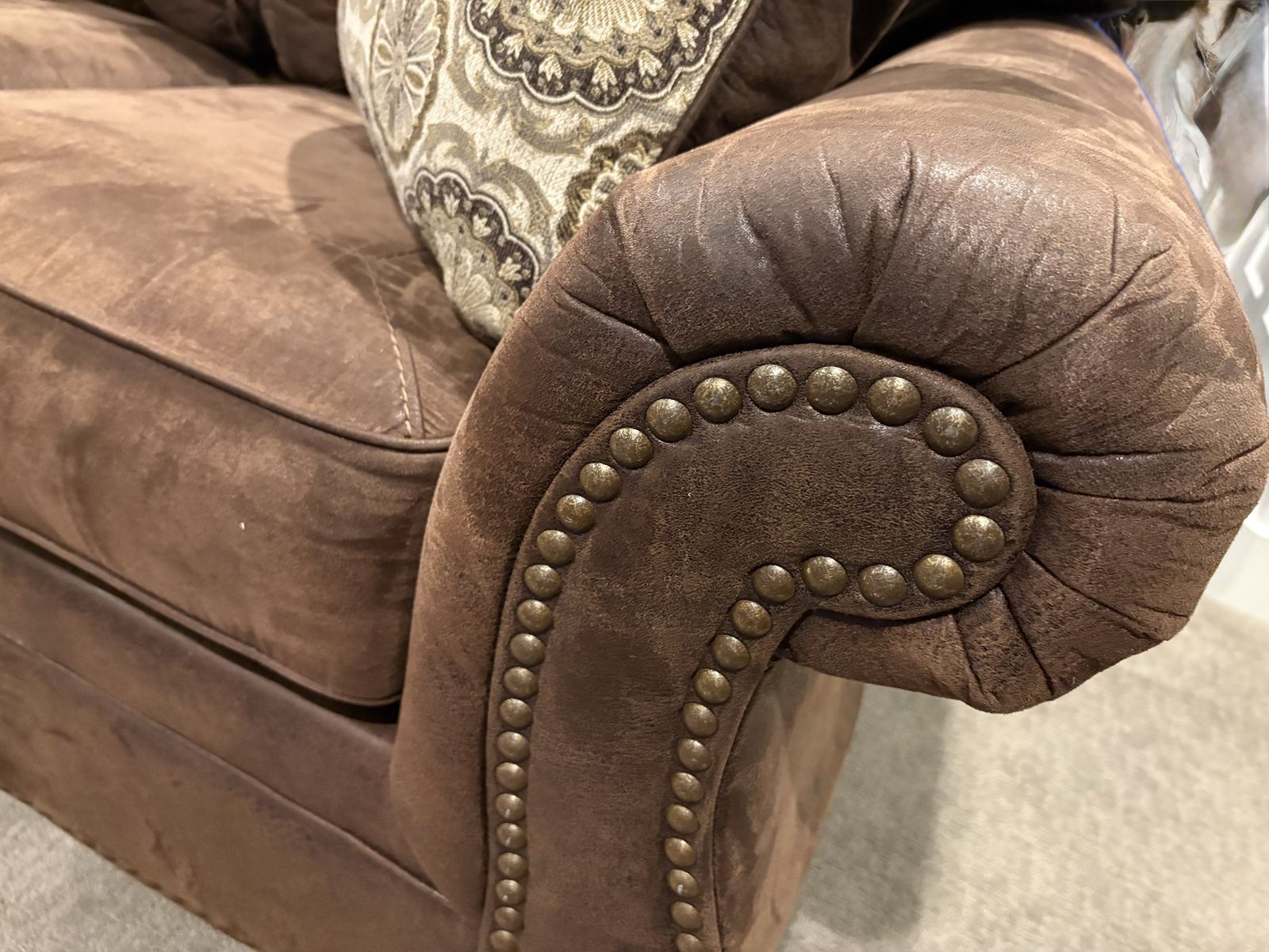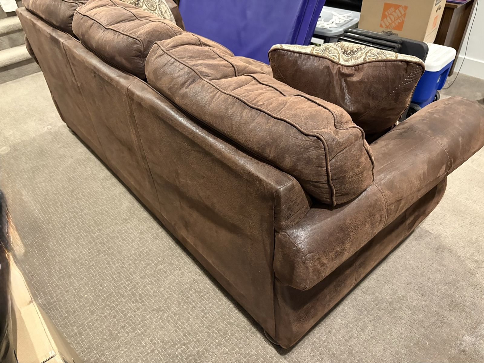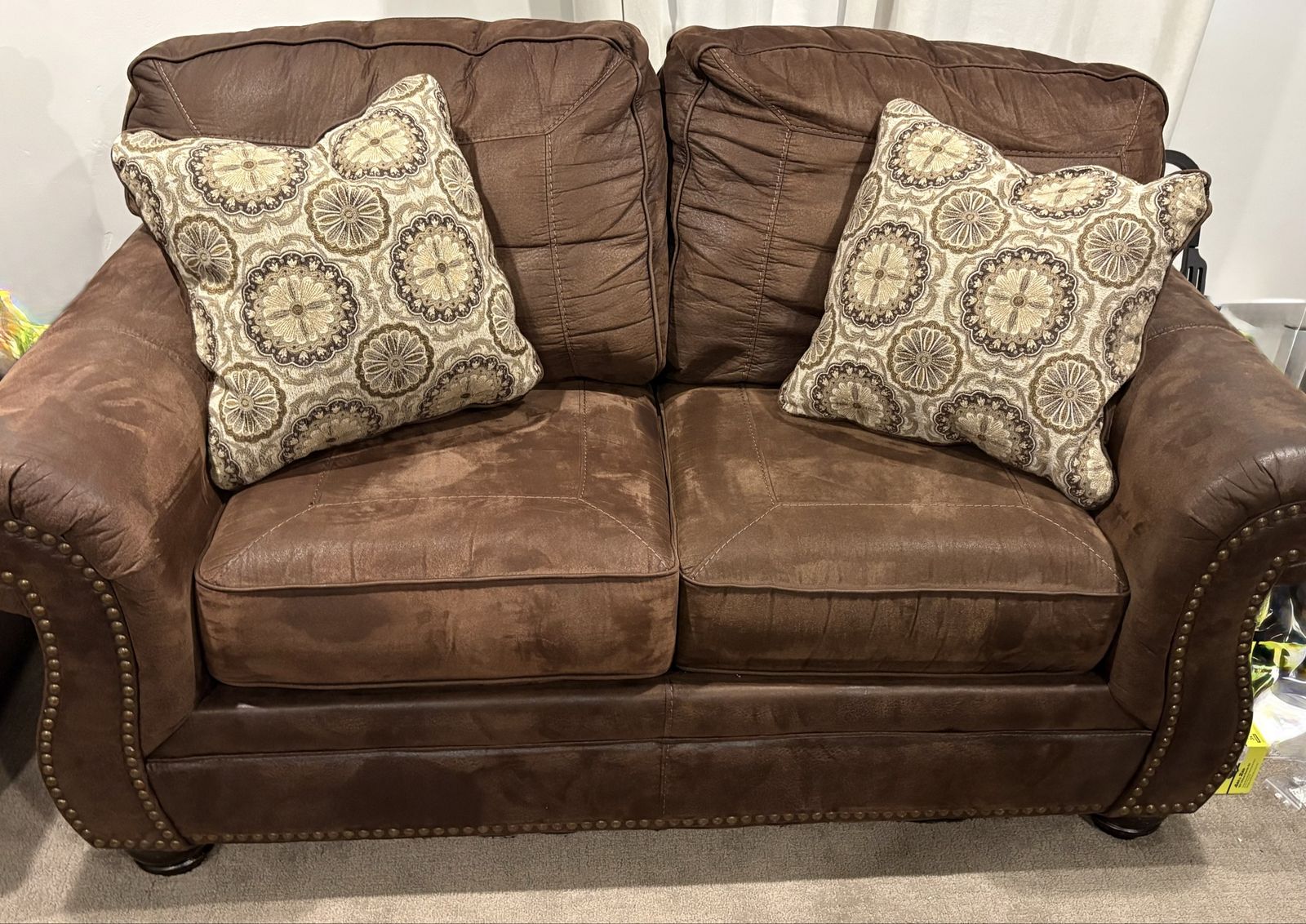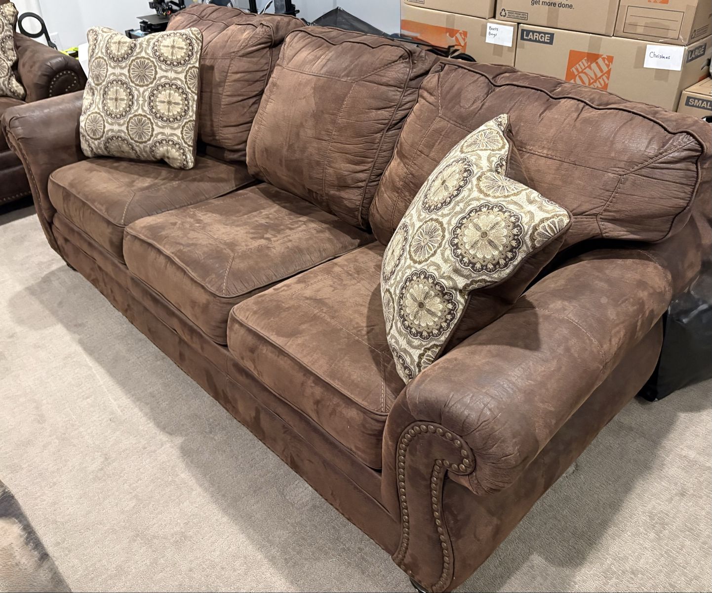 VenmoStylish 3-seater sofa and matching loveseat set in rich chocolate brown. Still looks sharp — soft microfiber upholstery (faux suede) with nailhead trim and rolled arms. Comfortable, sturdy, and family-friendly. Comes with four decorative throw pillows (as shown). No major stains or rips — just normal light wear for its age. Perfect for a living room or family room. Model: Ashley Larkinhurst, leather-look fabric Dimensions: Sofa 89”Wx39”Dx38”H Loveseat 66”Wx39”Dx38”H