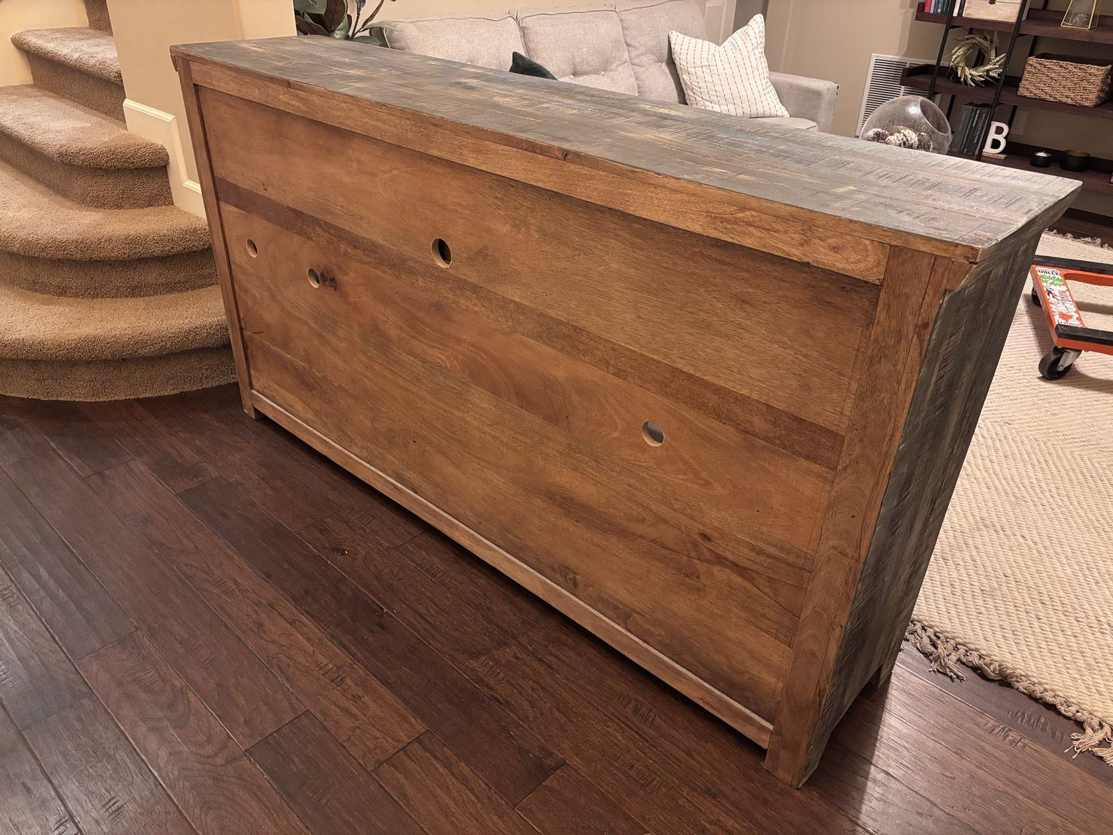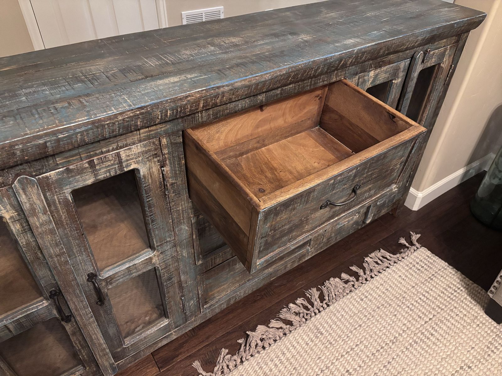 Solid wood - Rustic farmhouse-style media console / sideboard with a distressed, multicolor wood finish. Has three center drawers and four glass-front cabinet doors (two on each side) with interior shelving—great for storage or display. Solid and sturdy with a unique weathered look.
