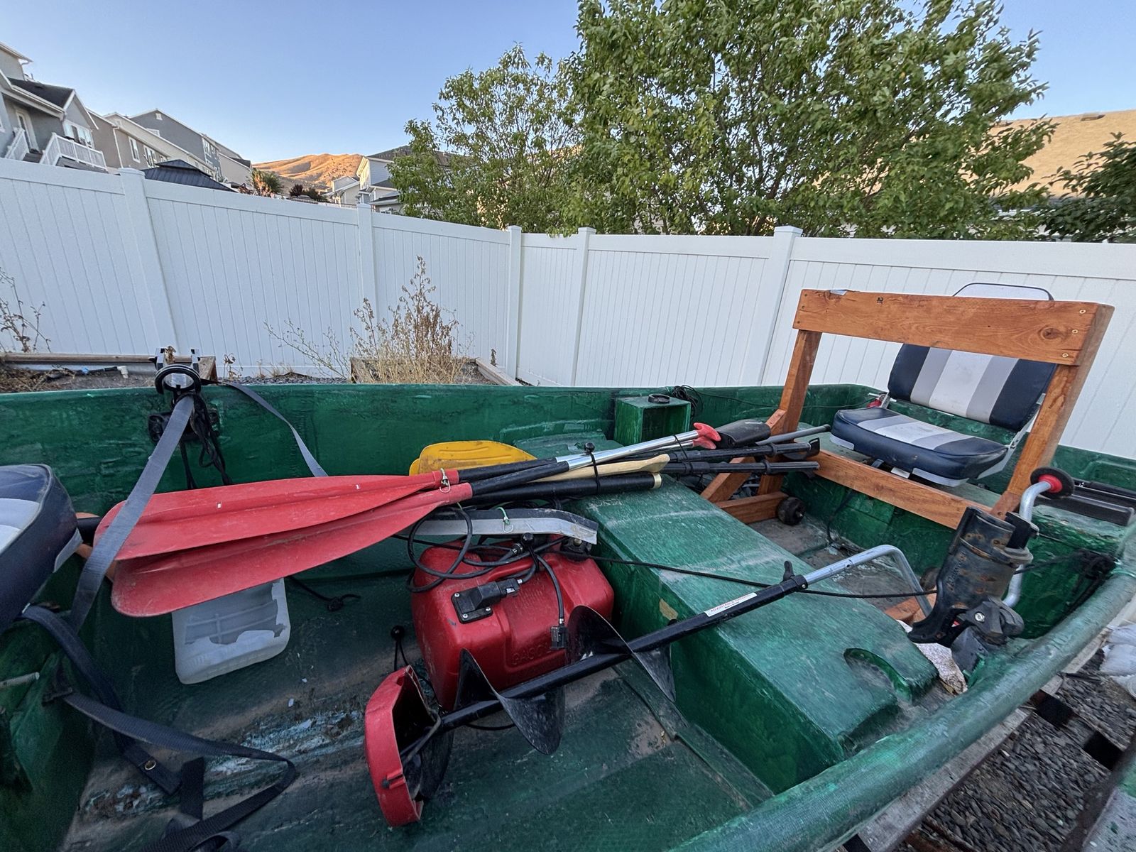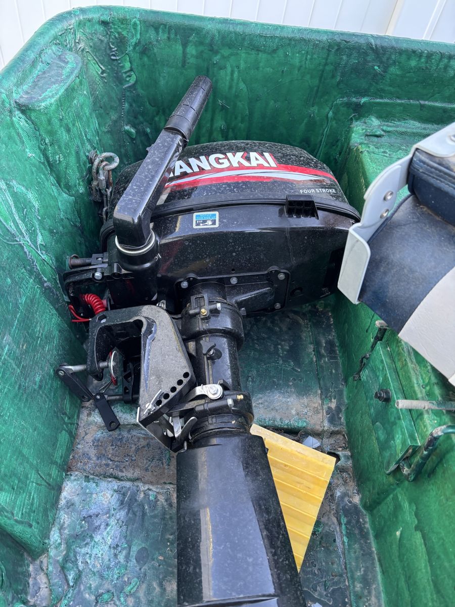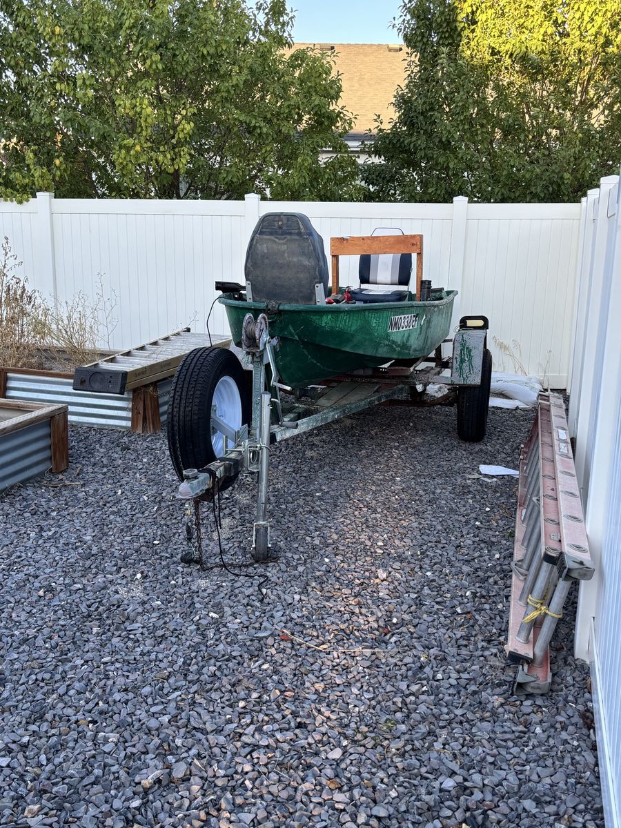 VenmoFiberglass fishing boat. New 6.5HP motor with storage stand and new tires. Recently re fiberglassed. New seats, life jackets and extras in picture 12’ long.