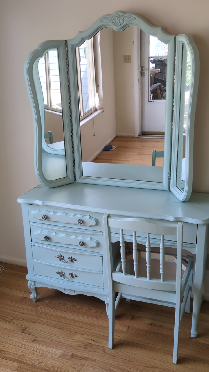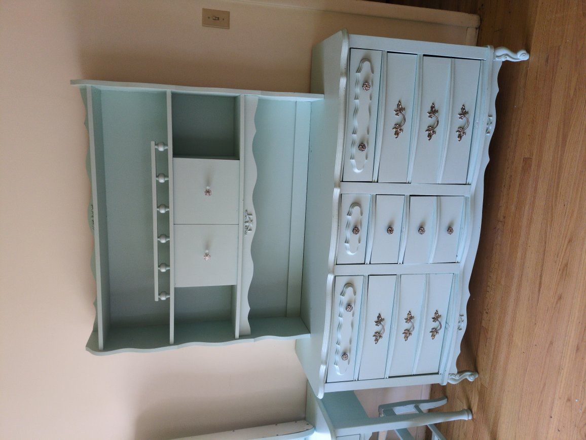This set has a lot of potential. It could use a fresh coat of paint. Some scratches from moving are showing the paint color underneath. One drawer in the bottom left of the dresser is sticking. Chair needs a new seat cover. Originally paid a few hundred for it. I had planned on using peel and stick wall paper to cover the inside of the drawers, but never got the chance as we are moving and can't take it with us. First come first serve. $300 obo.