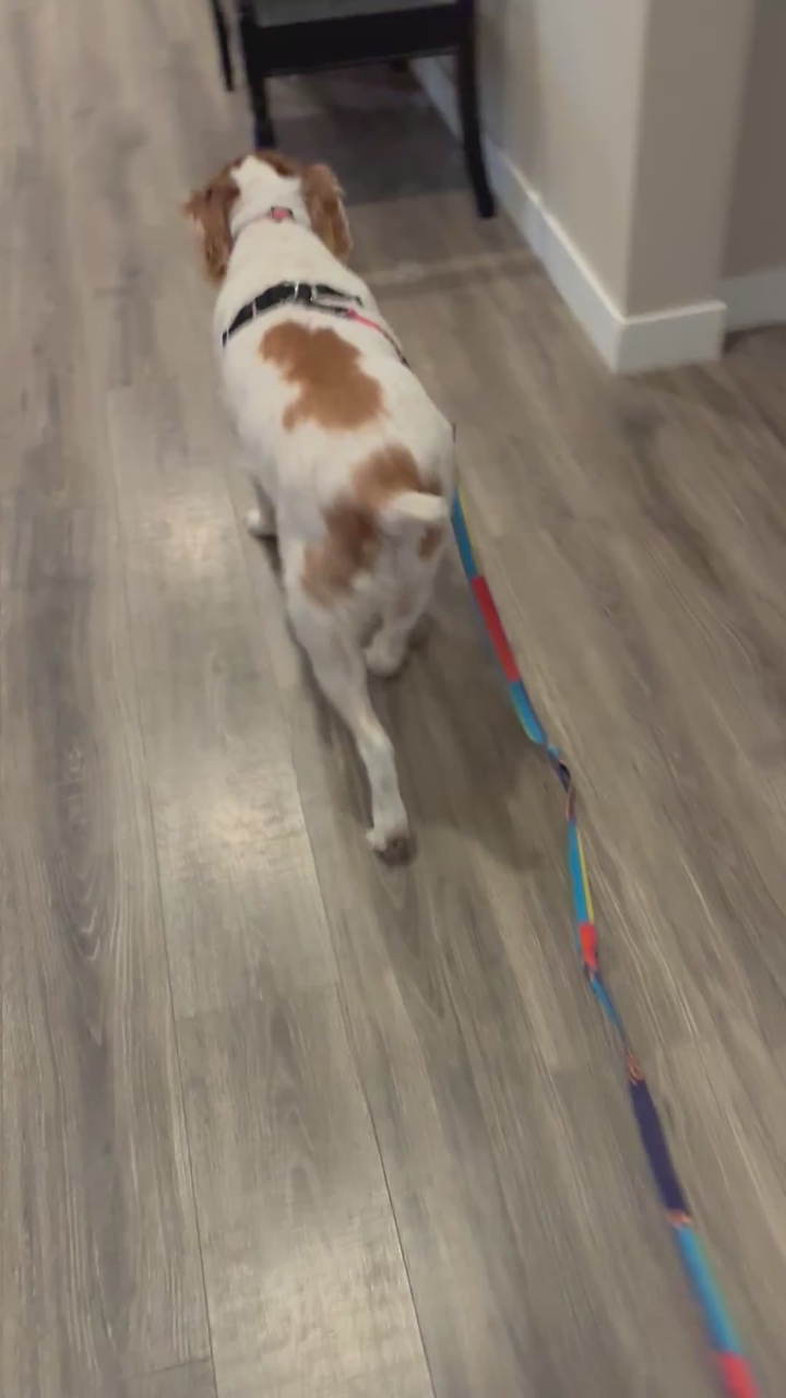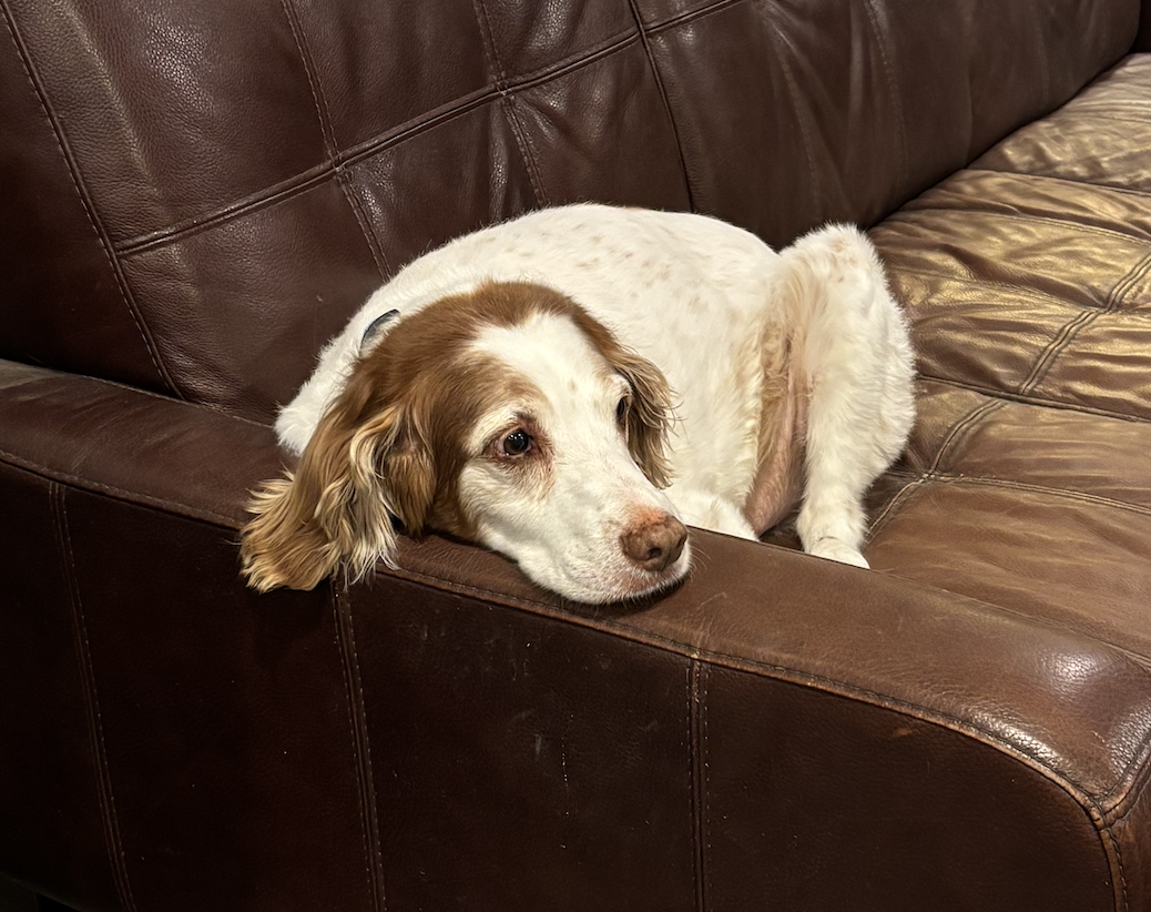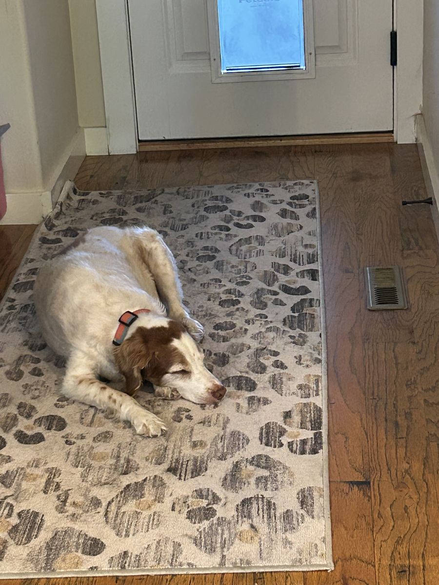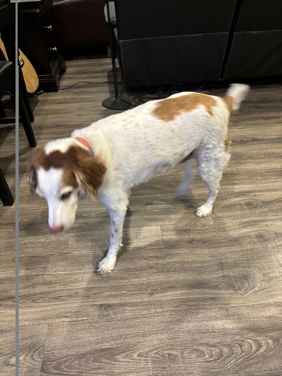 This is Apollo or "Pop Pop!" He is an extremely sweet and loving dog. We are moving and preparing to Serve, so we can't take him with us. He is an 11-year-old, pure bred, non-papered AKC Brittany, medium-sized dog. He's neutered, up to date on all shots and fully potty and house-trained. "He will ring a bell if he wants to go outside." We have had him since a puppy. He was born in Lindon, where his breeder is from.