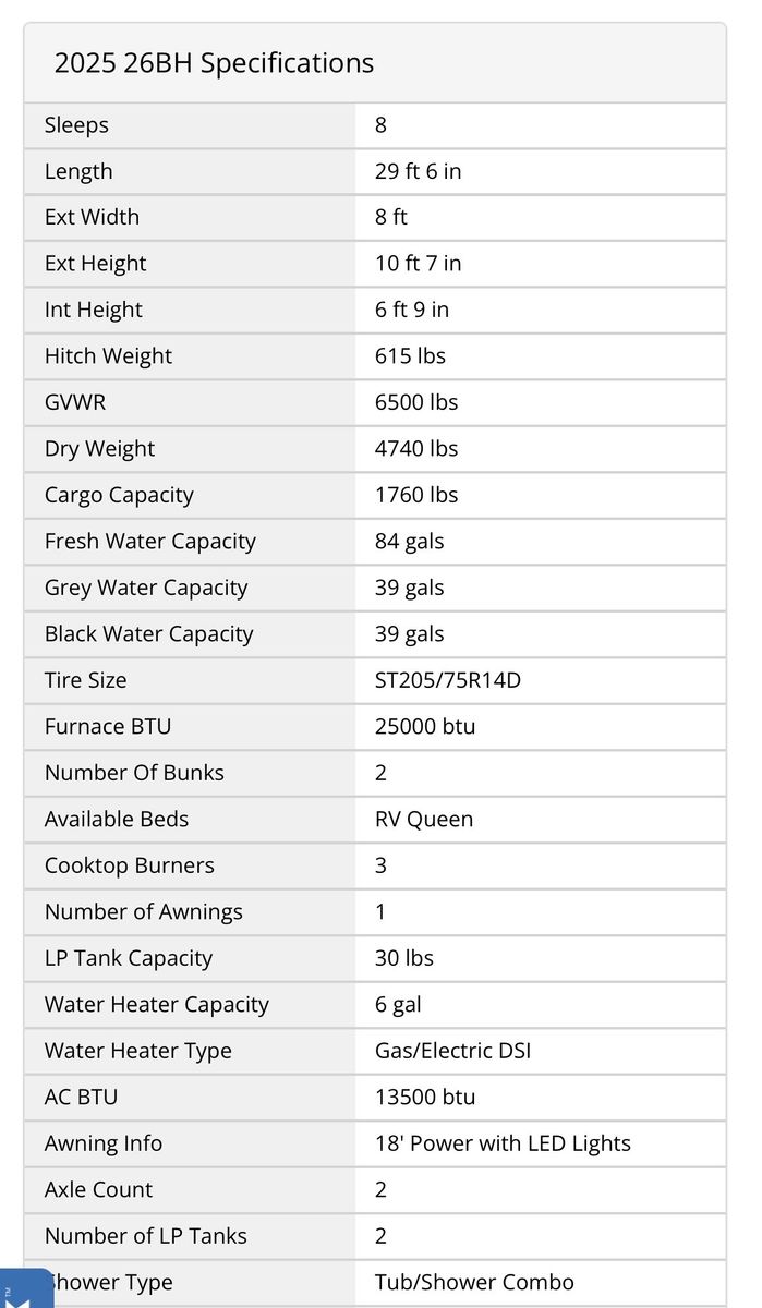 2025 26BH Specifications Sleeps 8 Length 29 ft 6 in Ext Width 8ft Ext Height 10 ft 7 in Int Height 6 ft 9 in Hitch Weight 615 Ibs GVWR 6500 Ibs Dry Weight 4740 Ibs Cargo Capacity 1760 Ibs Fresh Water Capacity 84 gals Grey Water Capacity 39 gals Black Water Capacity 39 gals Tire Size ST205/75R14D Furnace BTU 25000 btu Number Of Bunks 2 Available Beds RV Queen Cooktop Burners 3 Number of Awnings 1 LP Tank Capacity 30 Ibs Water Heater Capacity 6 gal Water Heater Type Gas/Electric DSI AC BTU 13500 btu Awning Info 18' Power with LED Lights Axle Count 2 Number of LP Tanks 2 Shower Type Tub/Shower Combo