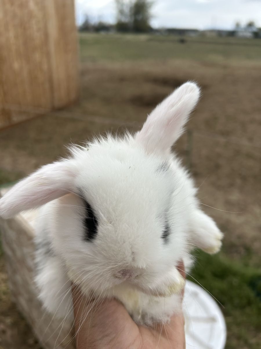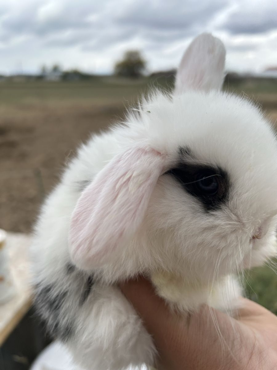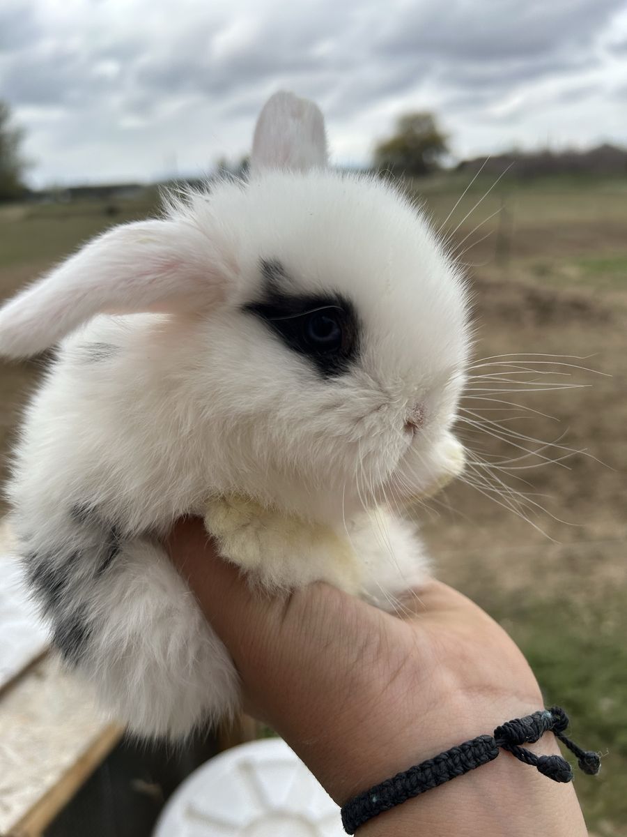 Last of the litter, black and white, adorable baby holland lop bunny rabbit! This guy is purebred, but not pedigreed. All of his siblings have been reserved already. He is ready to go to a new home on 23rd of May. He will come with a small bag of food so that he can adjust to his new food. I have been handling him since before he opened his eyes. Contact quick because he will go fast. I’m sure he would place great in a fair but would also make a great cuddly companion.